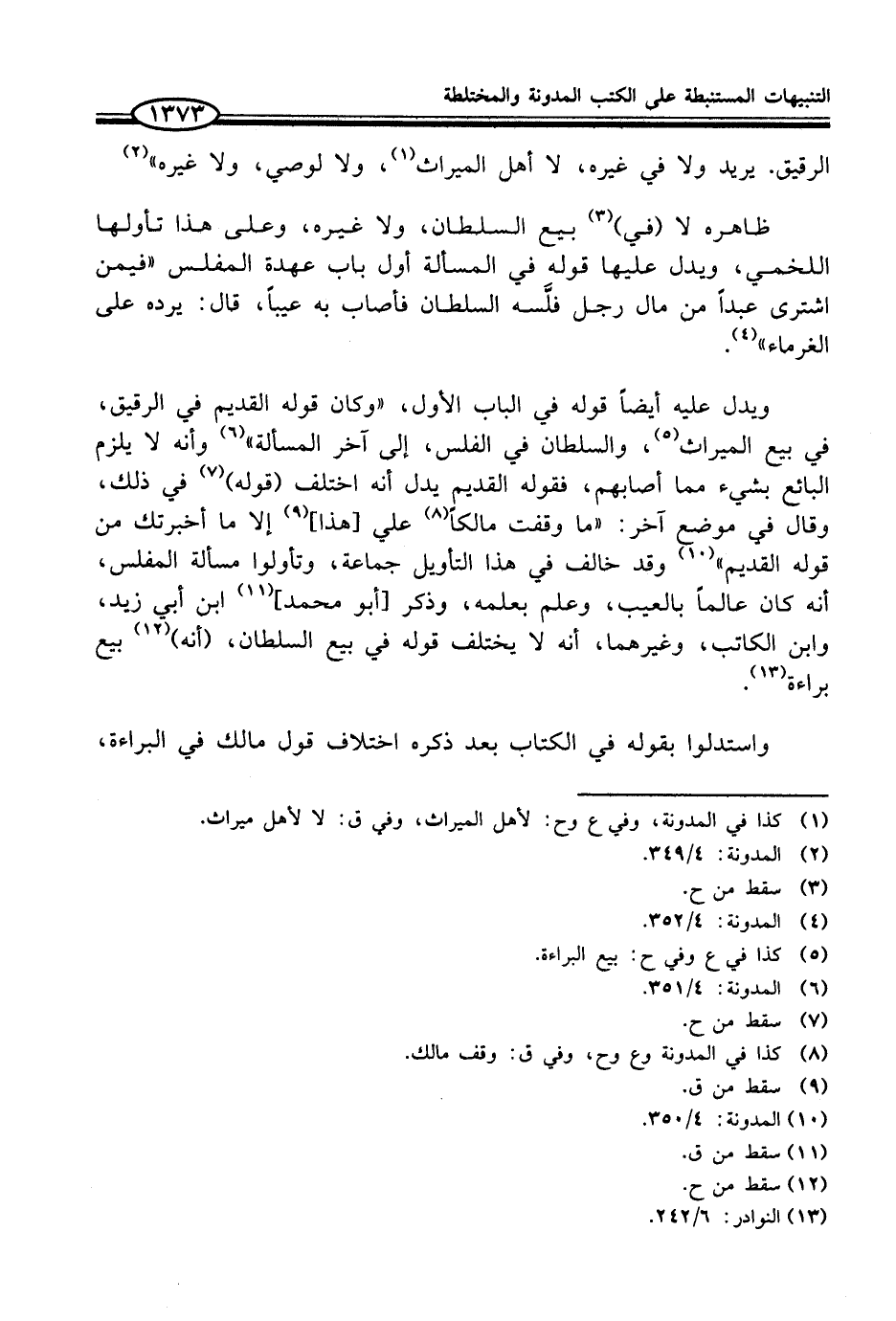 ويدل عليه أيضاً قوله في الباب الأول، "وكان قوله القديم في الرقيق، في بيع الميراث (¬5)، والسلطان في الفلس، إلى آخر المسألة" (¬6) وأنه لا يلزم البائع بشيء مما أصابهم، فقوله القديم يدل أنه اختلف (قوله) (¬7) في ذلك، وقال في موضع آخر: "ما وقفت مالكاً (¬8) علي [هذا] (¬9) إلا ما أخبرتك من قوله القديم" (¬10) وقد خالف في هذا التأويل جماعة، وتأولوا مسألة المفلس، أنه كان عالماً بالعيب، وعلم بعلمه، وذكر [أبو محمد] (¬11) ابن أبي زيد، وابن الكاتب، وغيرهما، أنه لا يختلف قوله في بيع السلطان، (أنه) (¬12) بيع براءة (¬13).
