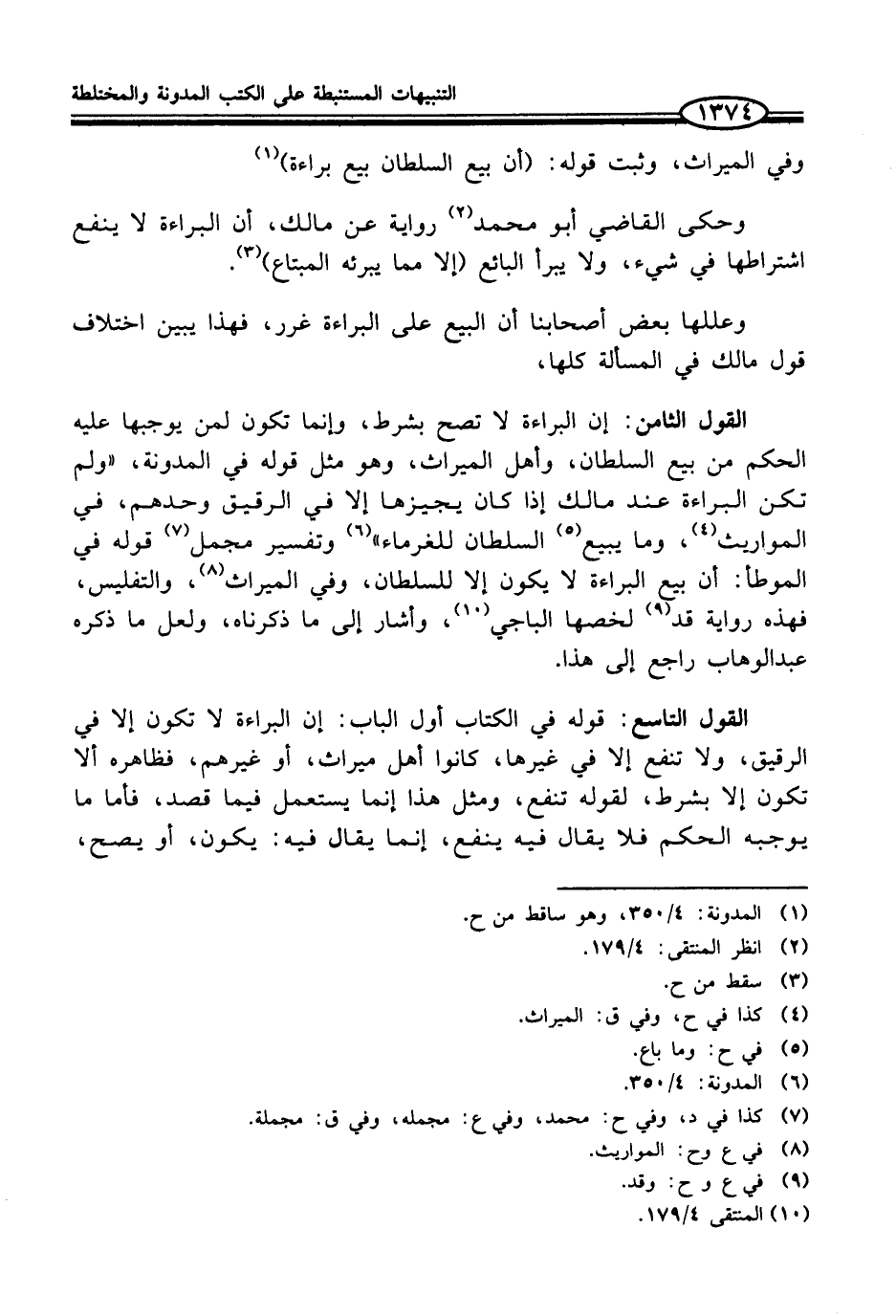 القول التاسع: قوله في الكتاب أول الباب: إن البراءة لا تكون إلا في الرقيق، ولا تنفع إلا في غيرها، كانوا أهل ميراث، أو غيرهم، فظاهره ألا تكون إلا بشرط، لقوله تنفع، ومثل هذا إنما يستعمل فيما قصد، فأما ما يوجبه الحكم فلا يقال فيه ينفع، إنما يقال فيه: يكون، أو يصح،