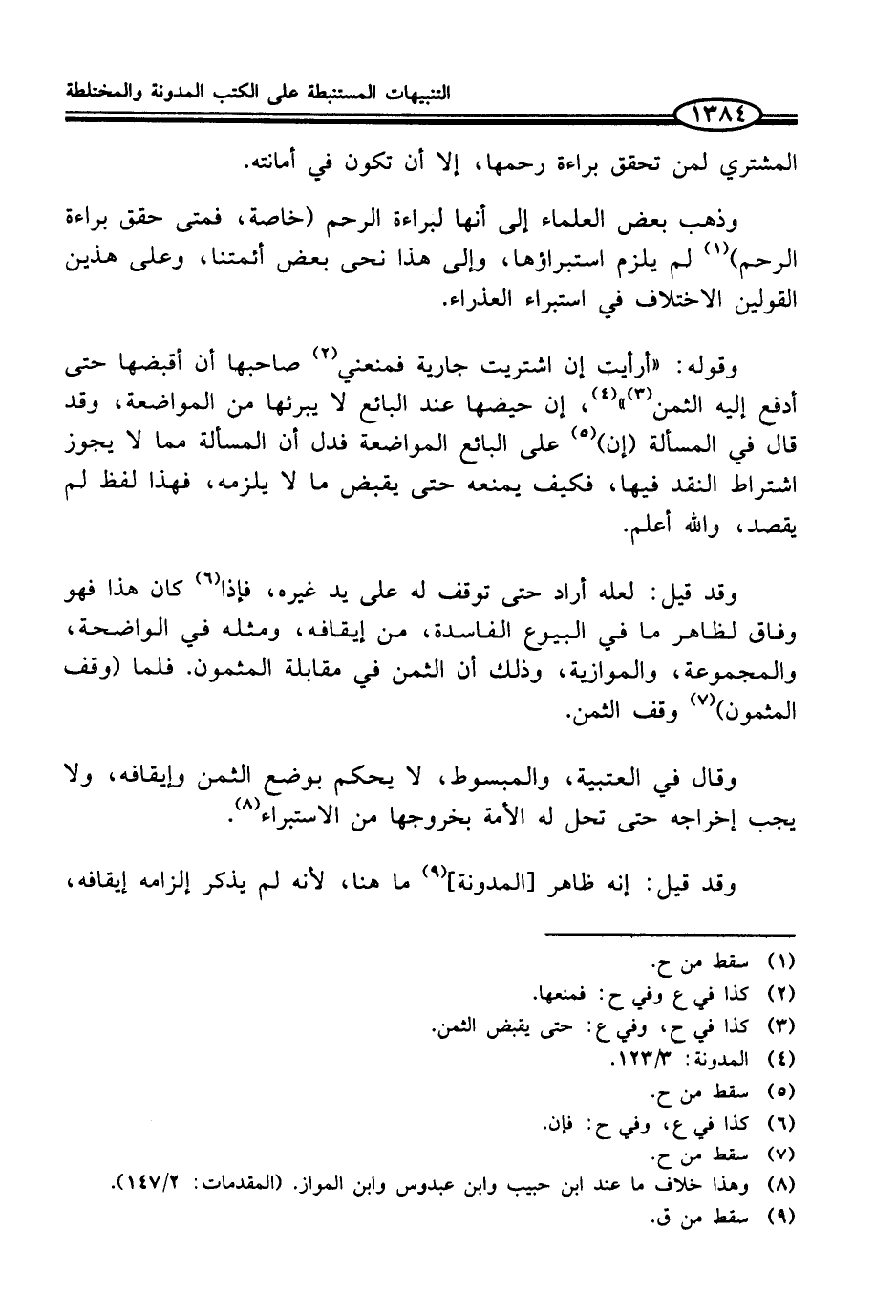(¬8) وهذا خلاف ما عند ابن حبيب وابن عبدوس وابن المواز. (المقدمات: 2/ 147).