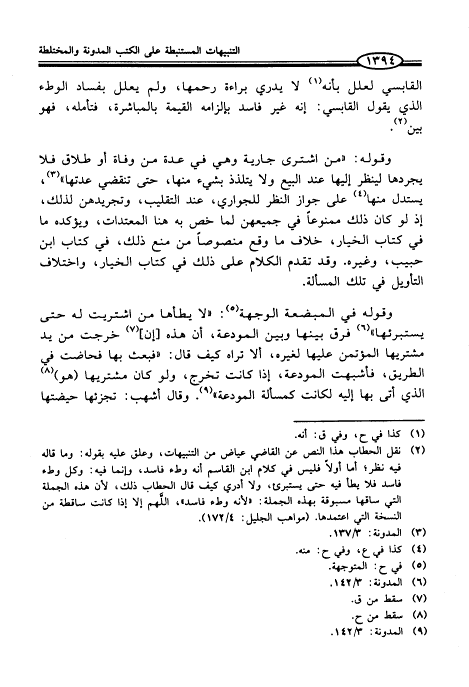 (¬2) نقل الحطاب هذا النص عن القاضي عياض من التنبيهات، وعلق عليه بقوله: وما قاله فيه نظر؛ أما أولاً فليس في كلام ابن القاسم أنه وطء فاسد، وإنما فيه: وكل وطء فاسد فلا يطأ فيه حتى يستبرئ، ولا أدري كيف قال الحطاب ذلك، لأن هذه الجملة التي ساقها مسبوقة بهذه الجملة: "لأنه وطء فاسد", اللَّهم إلا إذا كانت ساقطة من النسخة التي اعتمدها. (مواهب الجليل: 4/ 172).