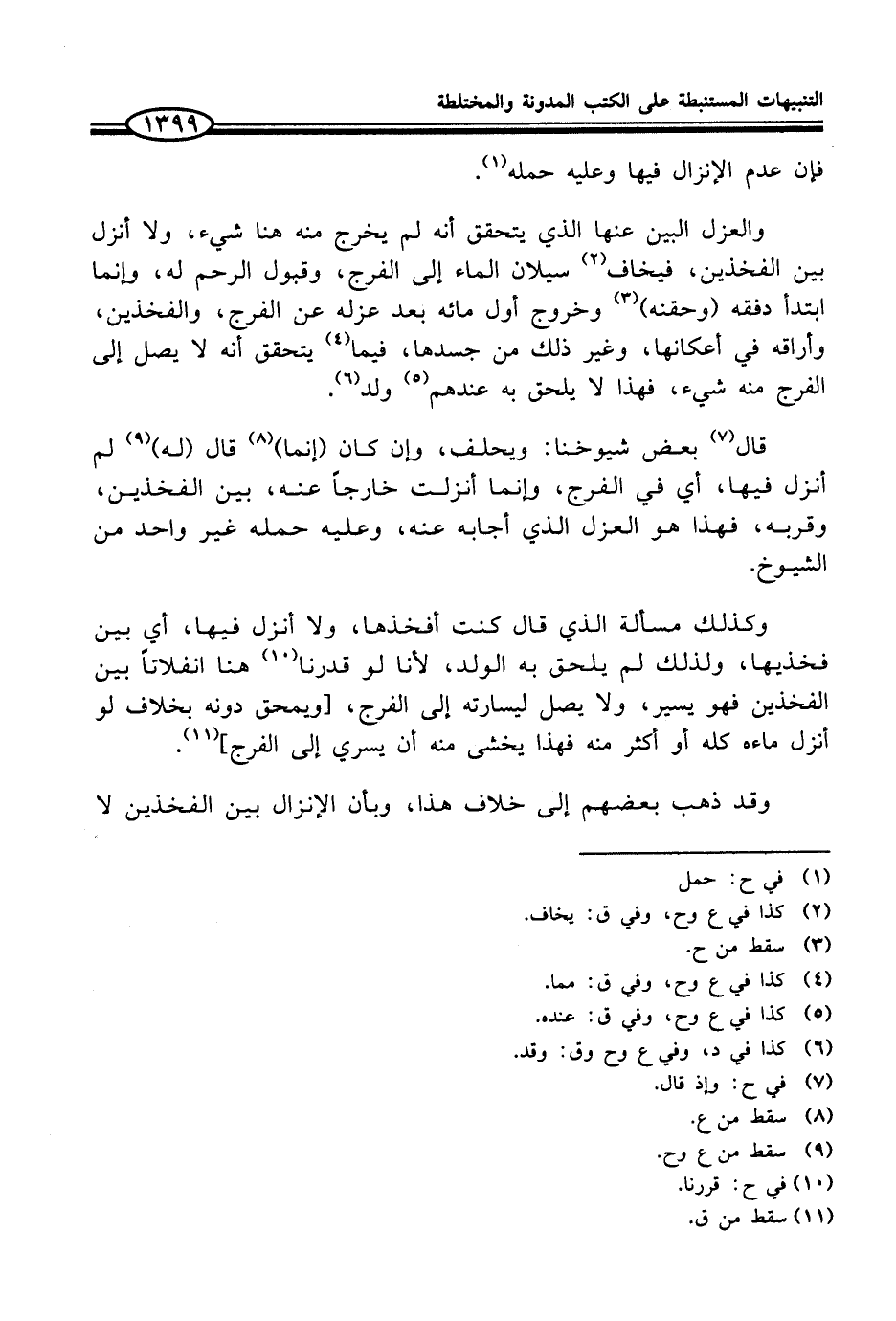والعزل البين عنها الذي يتحقق أنه لم يخرج منه هنا شيء، ولا أنزل بين الفخذين، فيخاف (¬2) سيلان الماء إلى الفرج، وقبول الرحم له، وإنما ابتدأ دفقه (وحقنه) (¬3) وخروج أول مائه بعد عزله عن الفرج، والفخذين، وأراقه في أعكانها، وغير ذلك من جسدها، فيما (¬4) يتحقق أنه لا يصل إلى الفرج منه شيء، فهذا لا يلحق به عندهم (¬5) ولد (¬6).