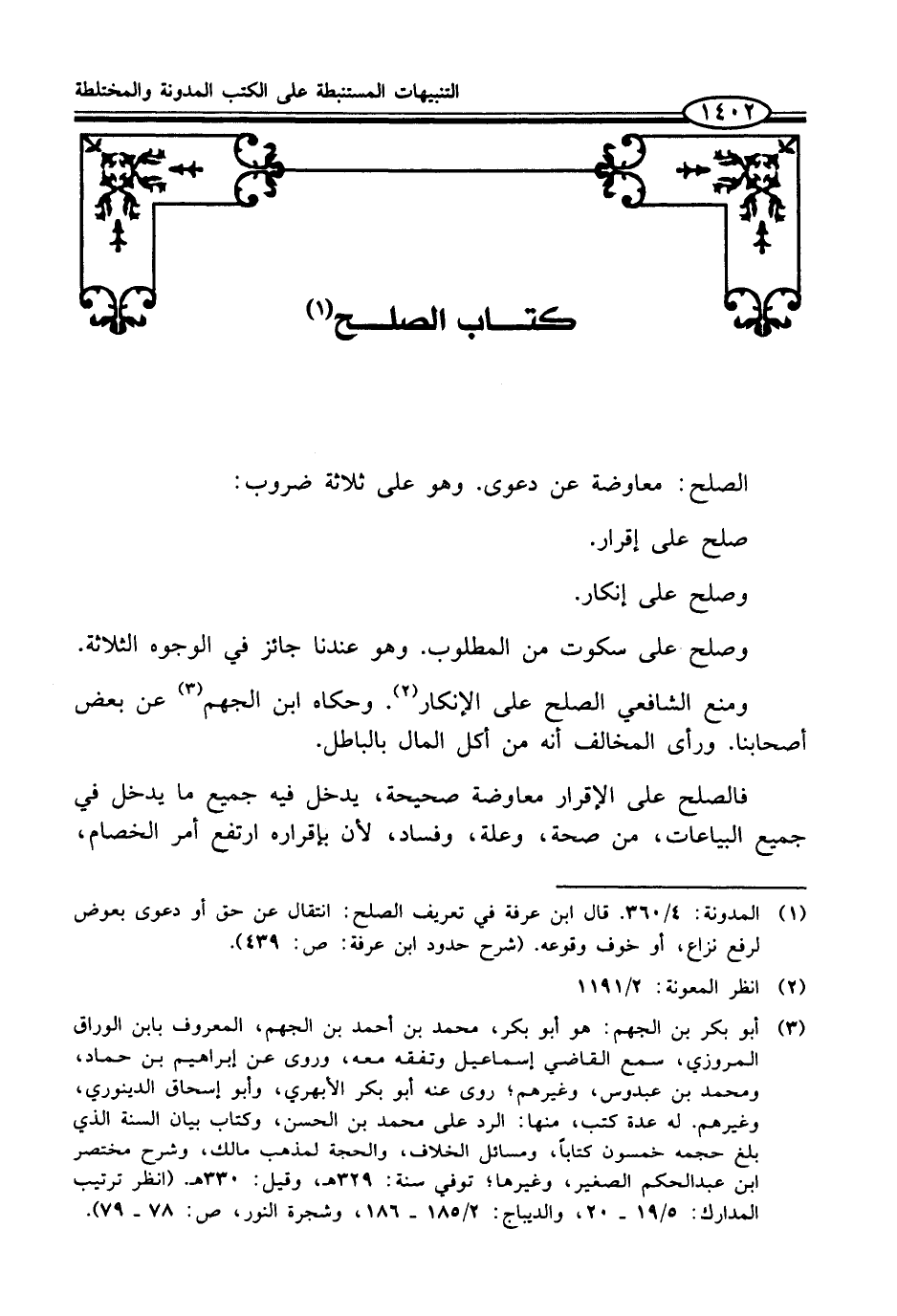 (¬1) المدونة: 4/ 360. قال ابن عرفة في تعريف الصلح: انتقال عن حق أو دعوى بعوض لرفع نزاع، أو خوف وقوعه. (شرح حدود ابن عرفة: ص: 439).