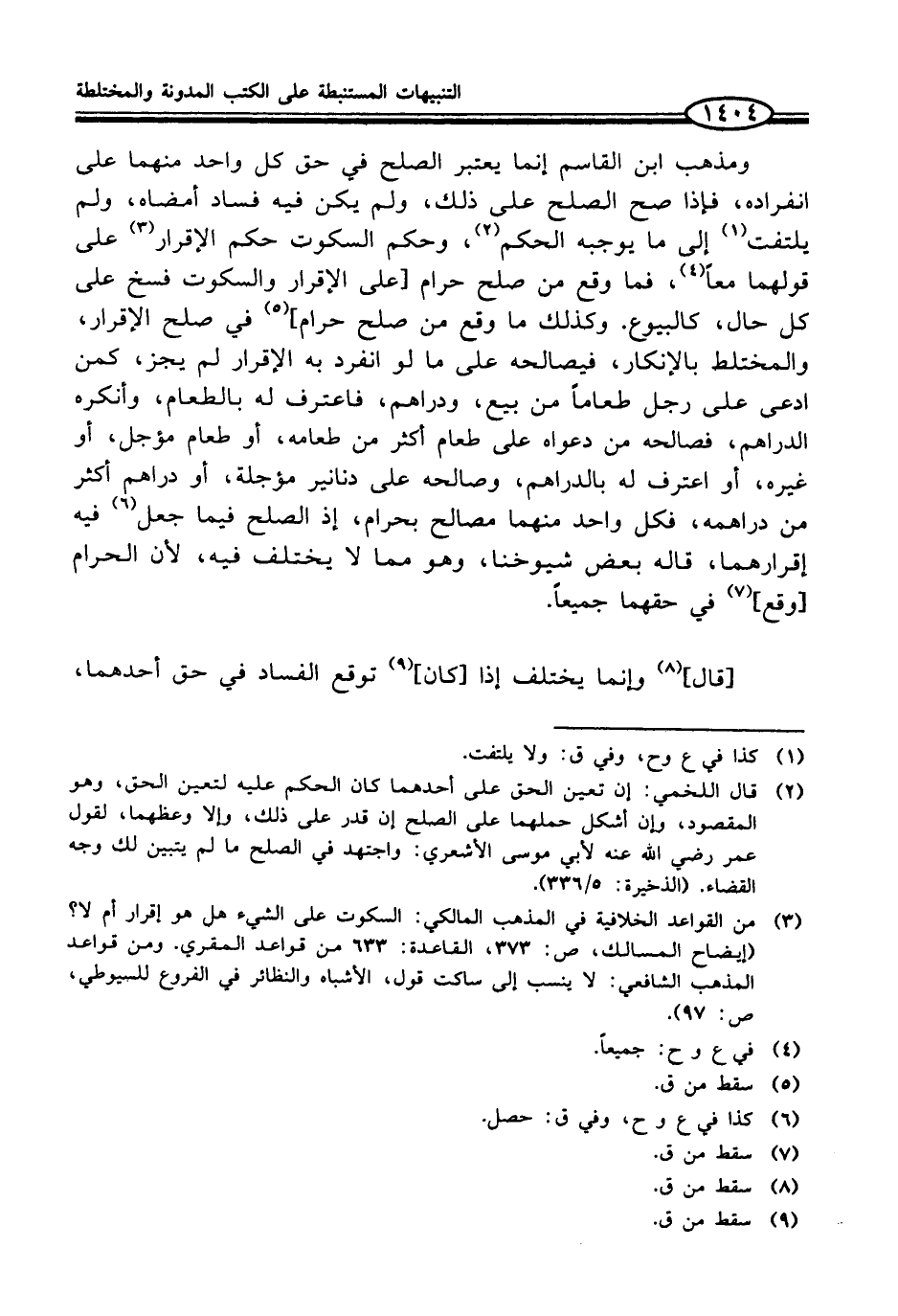 ومذهب ابن القاسم إنما يعتبر الصلح في حق كل واحد منهما على انفراده، فإذا صح الصلح على ذلك، ولم يكن فيه فساد أمضاه، ولم يلتفت (¬1) إلى ما يوجبه الحكم (¬2)، وحكم السكوت حكم الإقرار (¬3) على قولهما معاً (¬4)، فما وقع من صلح حرام [على الإقرار والسكوت فسخ على كل حال، كالبيوع. وكذلك ما وقع من صلح حرام] (¬5) في صلح الإقرار، والمختلط بالإنكار، فيصالحه على ما لو انفرد به الإقرار لم يجز، كمن ادعى على رجل طعاماً من بيع، ودراهم، فاعترف له بالطعام، وأنكره الدراهم، فصالحه من دعواه على طعام أكثر من طعامه، أو طعام مؤجل، أو غيره، أو اعترف له بالدراهم، وصالحه على دنانير مؤجلة، أو دراهم أكثر من دراهمه، فكل واحد منهما مصالح بحرام، إذ الصلح فيما جعل (¬6) فيه إقرارهما، قاله بعض شيوخنا، وهو مما لا يختلف فيه، لأن الحرام [وقع] (¬7) في حقهما جميعاً.