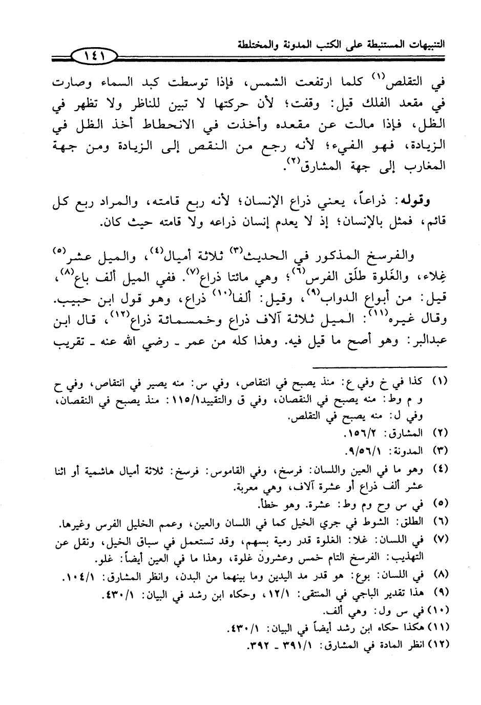 والفرسخ المذكور في الحديث (¬3) ثلاثة أميال (¬4)، والميل عشر (¬5) غِلاء، والغَلوة طلَق الفرس (¬6)؛ وهي مائتا ذراع (¬7). ففي الميل ألف باع (¬8)، قيل: من أبواع الدواب (¬9)، وقيل: ألفا (¬10) ذراع، وهو قول ابن حبيب. وقال غيره (¬11): الميل ثلاثة آلاف ذراع وخمسمائة ذراع (¬12)، قال ابن عبد البر: وهو أصح ما قيل فيه. وهذا كله من عمر - رضي الله عنه - تقريب