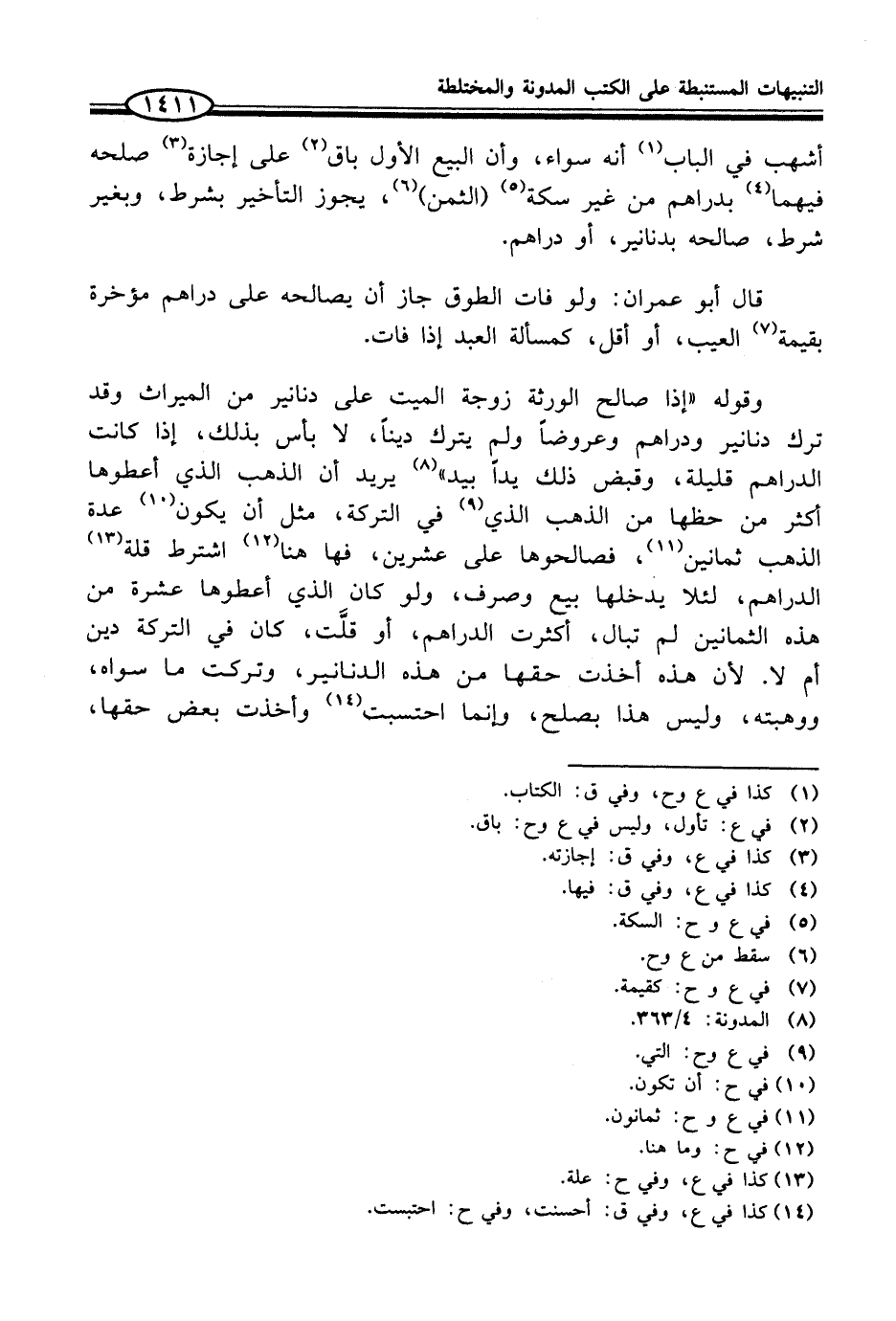 وقوله "إذا صالح الورثة زوجة الميت على دنانير من الميراث وقد ترك دنانير ودراهم وعروضاً ولم يترك ديناً، لا بأس بذلك، إذا كانت الدراهم قليلة، وقبض ذلك يداً بيد" (¬8) يريد أن الذهب الذي أعطوها أكثر من حظها من الذهب الذي (¬9) في التركة، مثل أن يكون (¬10) عدة الذهب ثمانين (¬11)، فصالحوها على عشرين، فها هنا (¬12) اشترط قلة (¬13) الدراهم، لئلا يدخلها بيع وصرف، ولو كان الذي أعطوها عشرة من هذه الثمانين لم تبال، أكثرت الدراهم، أو قلَّت، كان في التركة دين أم لا. لأن هذه أخذت حقها من هذه الدنانير، وتركت ما سواه، ووهبته، وليس هذا بصلح، وإنما احتسبت (¬14) وأخذت بعض حقها،