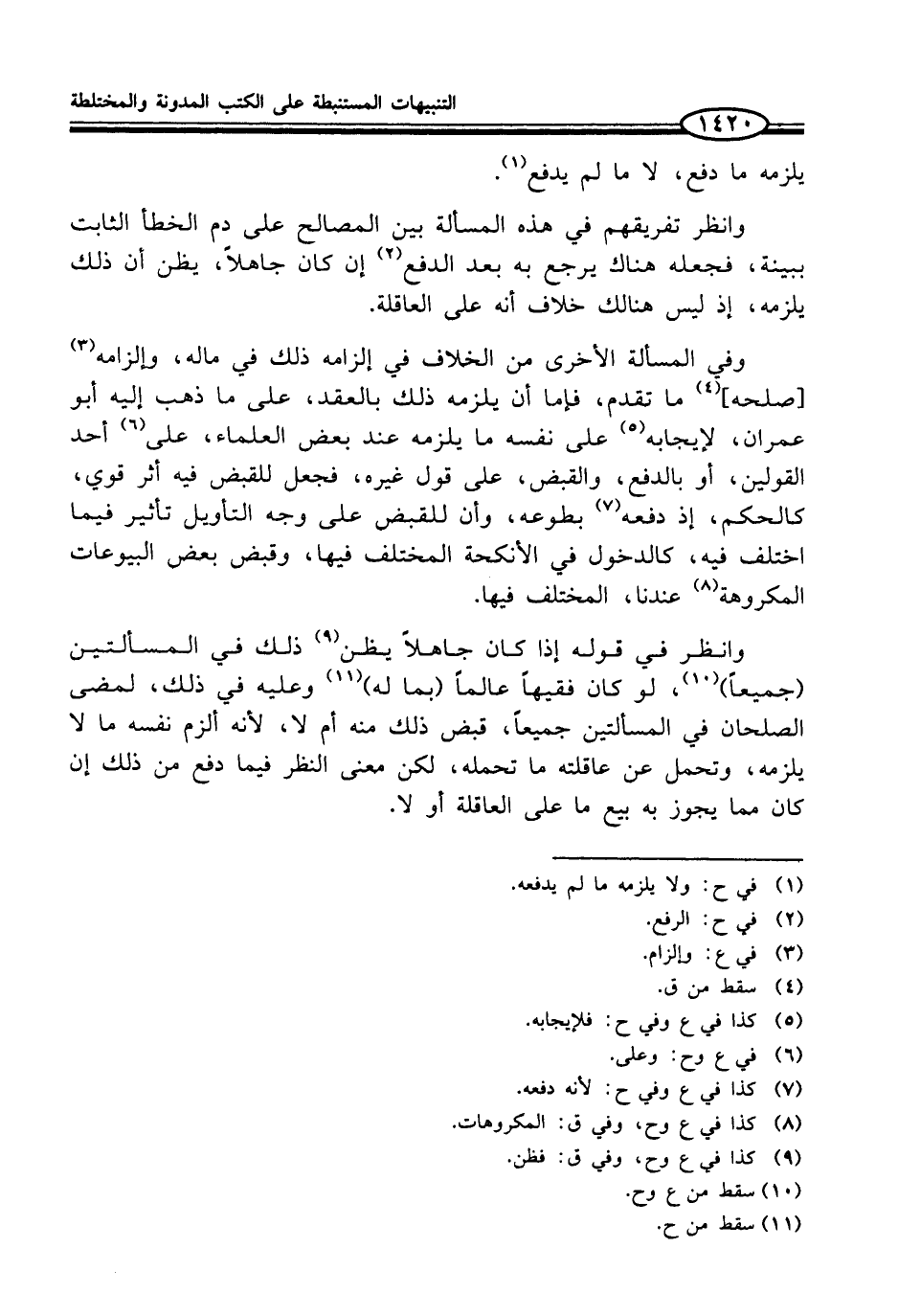 وانظر في قوله إذا كان جاهلاً يظن (¬9) ذلك في المسألتين (جميعاً) (¬10)، لو كان فقيهاً عالماً (بما له) (¬11) وعليه في ذلك، لمضى الصلحان في المسألتين جميعاً، قبض ذلك منه أم لا، لأنه ألزم نفسه ما لا يلزمه، وتحمل عن عاقلته ما تحمله، لكن معنى النظر فيما دفع من ذلك إن كان مما يجوز به بيع ما على العاقلة أو لا.