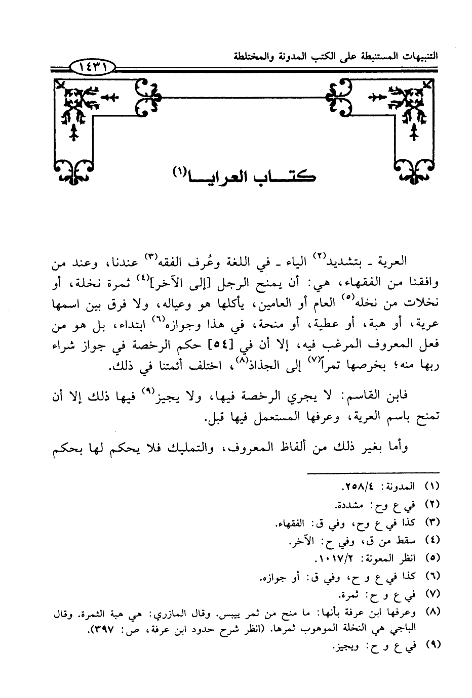 العرية - بتشديد (¬2) الياء - في اللغة وعُرف الفقه (¬3) عندنا، وعند من وافقنا من الفقهاء، هي: أن يمنح الرجل [إلى الآخر] (¬4) ثمرة نخلة، أو نخلات من نخله (¬5) العام أو العامين، يأكلها هو وعياله، ولا فرق بين اسمها عرية، أو هبة، أو عطية، أو منحة، في هذا وجوازه (¬6) ابتداء، بل هو من فعل المعروف المرغب فيه، إلا أن في [54] حكم الرخصة في جواز شراء ربها منه؛ بخرصها تمراً (¬7) إلى الجذاذ (¬8)، اختلف أئمتنا في ذلك.