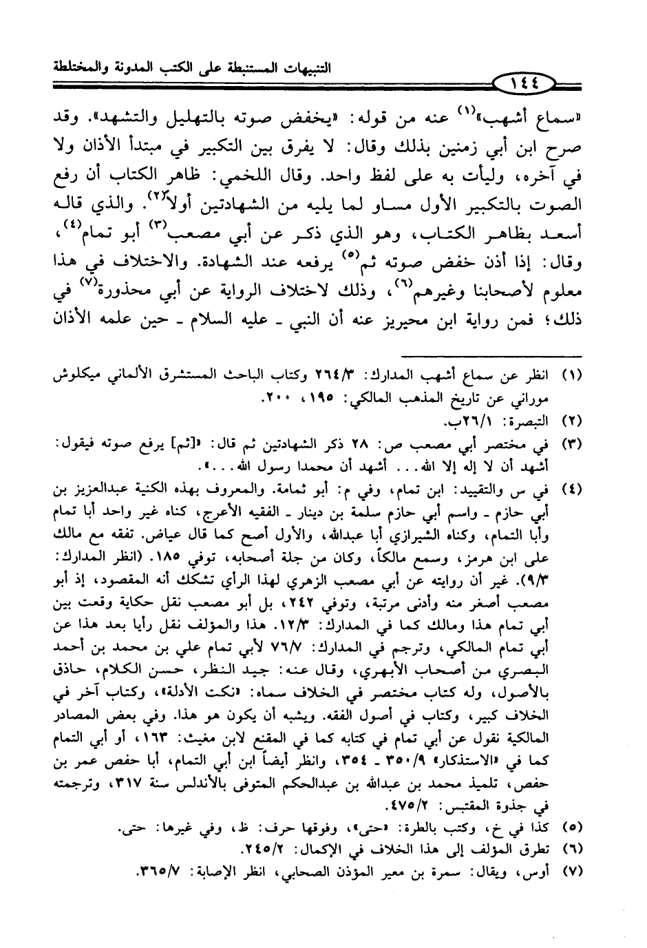 (¬4) في س والتقييد: ابن تمام، وفي م: أبو ثمامة. والمعروف بهذه الكنية عبد العزيز بن أبي حازم - واسم أبي حازم سلمة بن دينار - الفقيه الأعرج، كناه غير واحد أبا تمام وأبا التمام، وكناه الشيرازي أبا عبد الله، والأول أصح كما قال عياض. تفقه مع مالك على ابن هرمز، وسمع مالكاً، وكان من جلة أصحابه، توفي 185. (انظر المدارك: 3/ 9). غير أن روايته عن أبي مصعب الزهري لهذا الرأي تشكك أنه المقصود، إذ أبو مصعب أصغر منه وأدنى مرتبة، وتوفي 242، بل أبو مصعب نقل حكاية وقعت بين أبي تمام هذا ومالك كما في المدارك: 3/ 12. هذا والمؤلف نقل رأيا بعد هذا عن أبي تمام المالكي، وترجم في المدارك: 7/ 76 لأبي تمام علي بن محمَّد بن أحمد البصري من أصحاب الأبهري، وقال عنه: جيد النظر، حسن الكلام، حاذق بالأصول، وله كتاب مختصر في الخلاف سماه: "نكت الأدلة"، وكتاب آخر في الخلاف كبير، وكتاب في أصول الفقه. ويشبه أن يكون هو هذا. وفي بعض المصادر المالكية نقول عن أبي تمام في كتابه كما في المقنع لابن مغيث: 163، أو أبي التمام كما في "الاستذكار" 9/ 350 - 354، وانظر أيضاً ابن أبي التمام، أبا حفص عمر بن حفص، تلميذ محمَّد بن عبد الله بن عبد الحكم المتوفى بالأندلس سنة 317، وترجمته في جذوة المقتبس: 2/ 475.