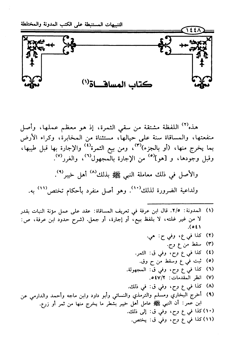 (¬1) المدونة: 5/ 2. قال ابن عرفة في تعريف المساقاة: عقد على عمل مؤنة النبات بقدر لا من غير غلته، لا بلفظ بيع، أو إجارة، أو جعل. (شرح حدود ابن عرفة، ص: 541).
