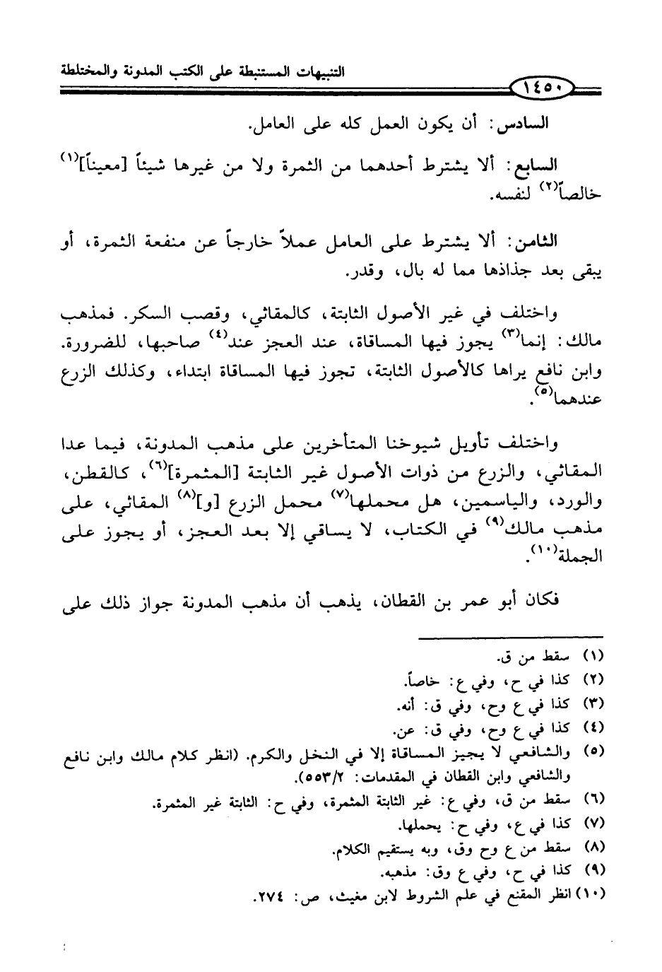 (¬5) والشافعي لا يجيز المساقاة إلا في النخل والكرم. (انظر كلام مالك وابن نافع والشافعي وابن القطان في المقدمات: 2/ 553).