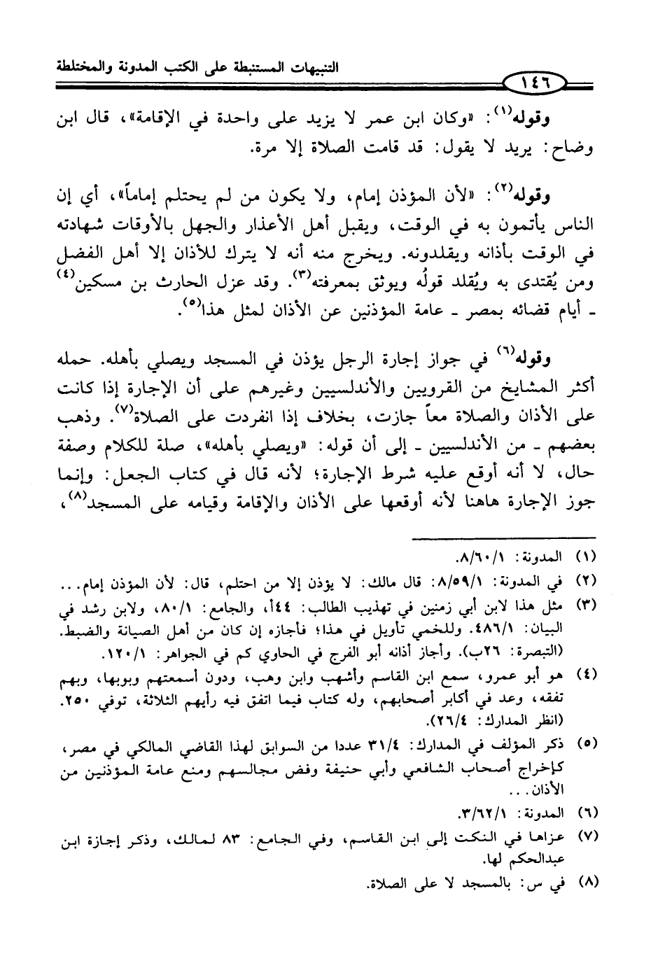 (¬4) هو أبو عمرو، سمع ابن القاسم وأشهب وابن وهب، ودون أسمعتهم وبوبها، وبهم تفقه، ومحمد في أكابر أصحابهم، وله كتاب فيما اتفق فيه رأيهم الثلاثة، توفي 250. (انظر المدارك: 4/ 26).