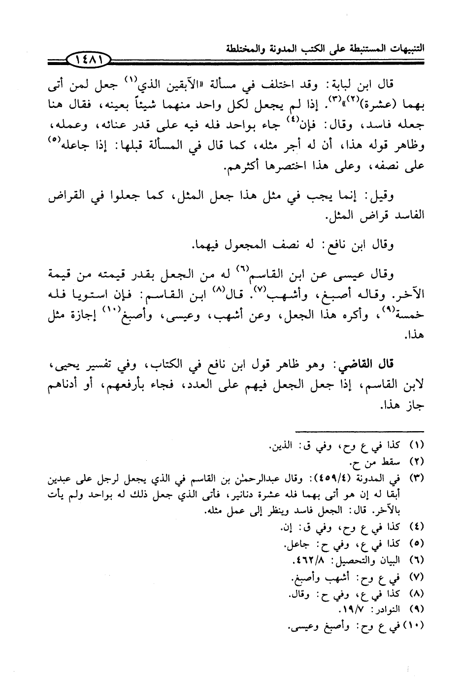 (¬3) في المدونة (4/ 459): وقال عبد الرحمن بن القاسم في الذي يجعل لرجل على عبدين أبقا له إن هو أتى بهما فله عشرة دنانير، فأتى الذي جعل ذلك له بواحد ولم يأت بالآخر. قال: الجعل فاسد وينظر إلى عمل مثله.