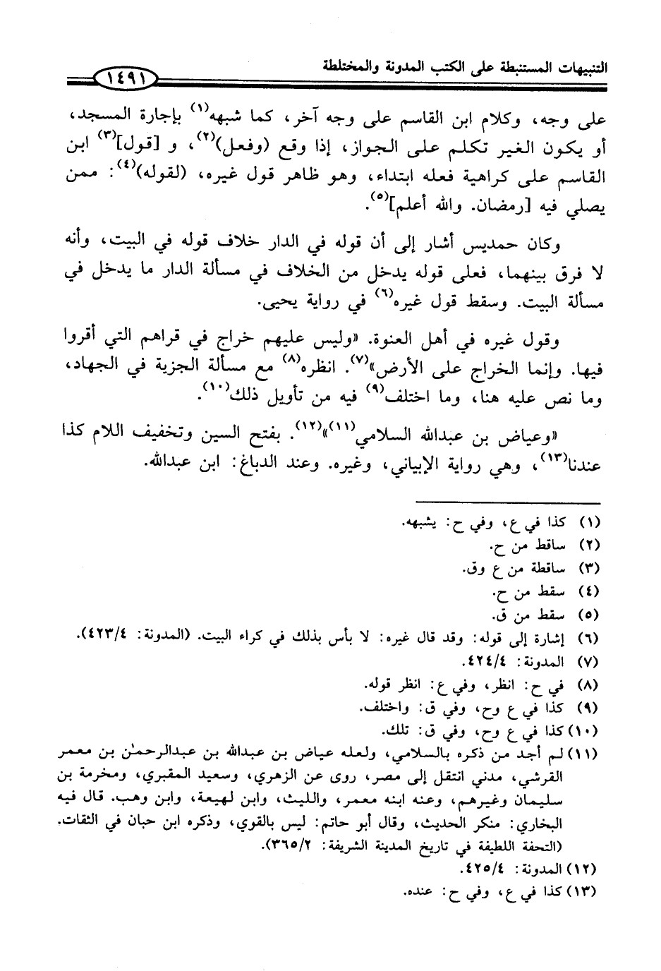 (¬11) لم أجد من ذكره بالسلامي، ولعله عياض بن عبد الله بن عبد الرحمن بن معمر القرشي، مدني انتقل إلى مصر، روى عن الزهري، وسعيد المقبري، ومخرمة بن سليمان وغيرهم، وعنه ابنه معمر، والليث، وابن لهيعة، وابن وهب. قال فيه البخاري: منكر الحديث، وقال أبو حاتم: ليس بالقوي، وذكره ابن حبان في الثقات. (التحفة اللطيفة في تاريخ المدينة الشريفة: 2/ 365).