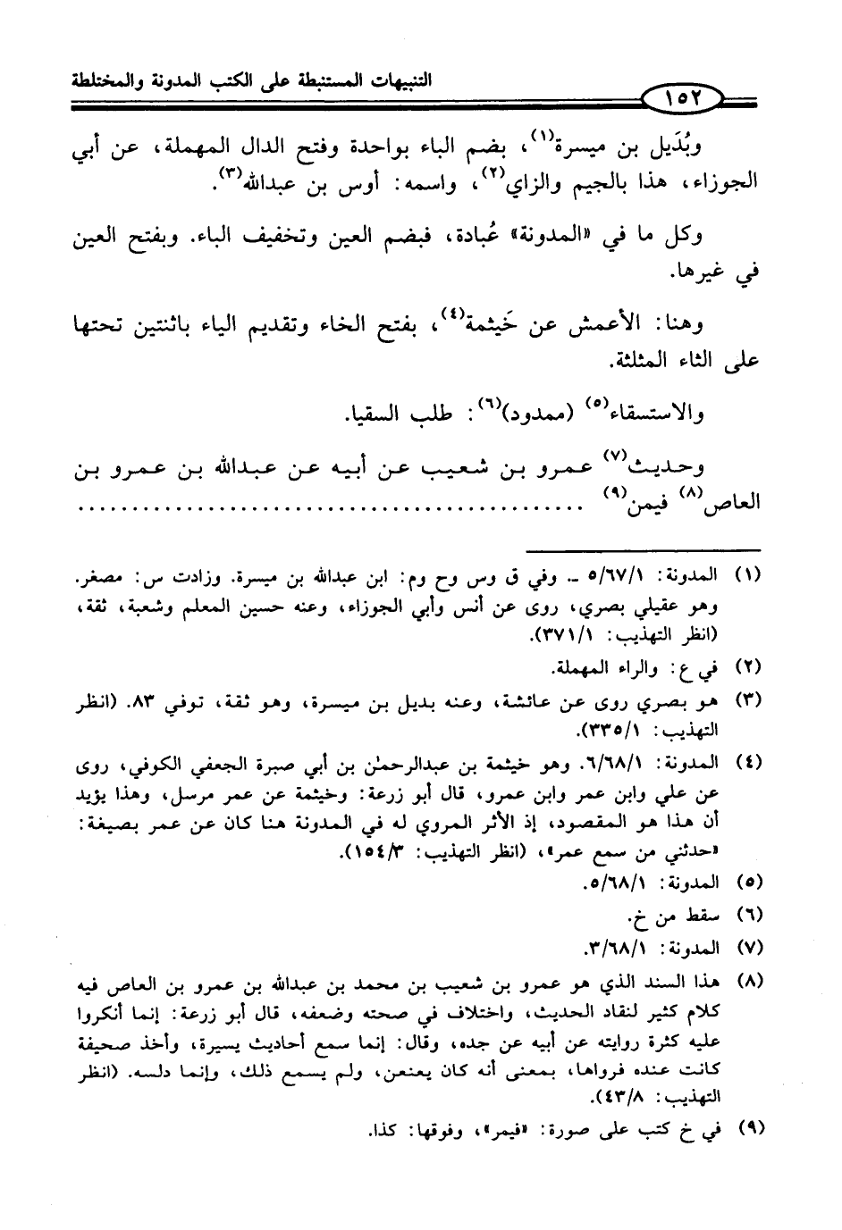 (¬4) المدونة: 1/ 68/ 6. وهو خيثمة بن عبد الرحمن بن أبي صبرة الجعفي الكوفي، روى عن علي وابن عمر وابن عمرو، قال أبو زرعة: وخيثمة عن عمر مرسل، وهذا يؤيد أن هذا هو المقصود، إذ الأثر المروي له في المدونة هنا كان عن عمر بصيغة: "حدثني من سمع عمر"، (انظر التهذيب: 3/ 154).