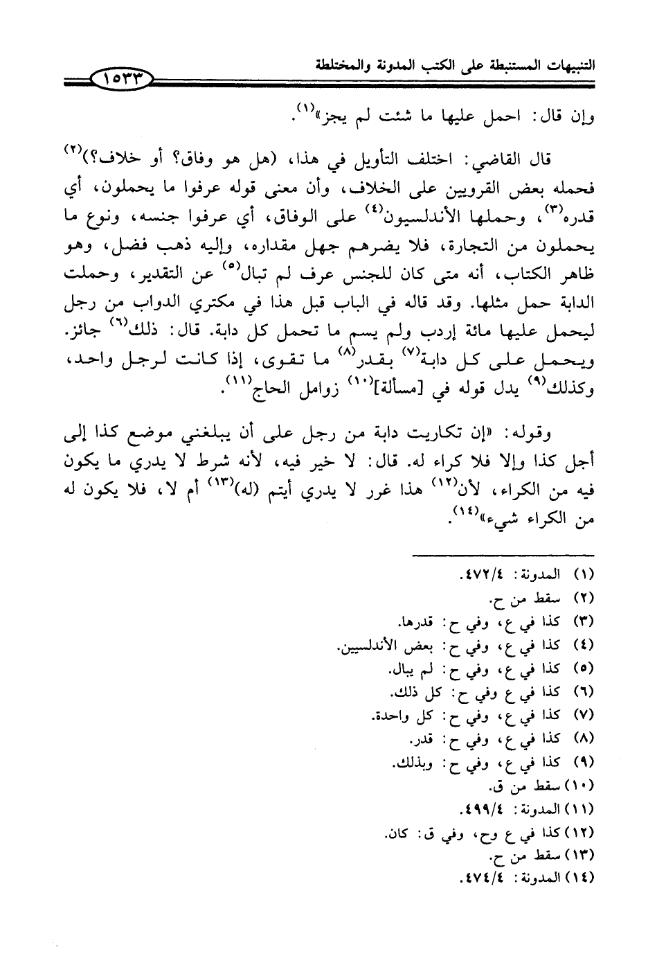 قال القاضي: اختلف التأويل في هذا، (هل هو وفاق؟ أو خلاف؟) (¬2) فحمله بعض القرويين على الخلاف، وأن معنى قوله عرفوا ما يحملون، أي قدره (¬3)، وحملها الأندلسيون (¬4) على الوفاق، أي عرفوا جنسه، ونوع ما يحملون من التجارة، فلا يضرهم جهل مقداره، وإليه ذهب فضل، وهو ظاهر الكتاب، أنه متى كان للجنس عرف لم تبال (¬5) عن التقدير، وحملت الدابة حمل مثلها. وقد قاله في الباب قبل هذا في مكتري الدواب من رجل ليحمل عليها مائة إردب ولم يسم ما تحمل كل دابة. قال: ذلك (¬6) جائز. ويحمل على كل دابة (¬7) بقدر (¬8) ما تقوى، إذا كانت لرجل واحد، وكذلك (¬9) يدل قوله في [مسألة] (¬10) زوامل الحاج (¬11).