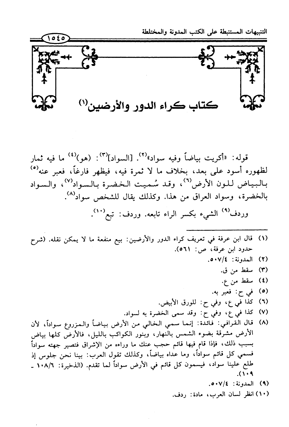 (¬8) قال القرافي: فائدة: إنما سمي الخالي من الأرض بياضاً والمزروع سواداً، لأن الأرض مشرقة بضوء الشمس بالنهار، وبنور الكواكب بالليل، فالأرض كلها بياض بسبب ذلك، فإذا قام فيها قائم حجب عنك ما وراءه من الإشراق فتصير جهته سواداً فسمي كل قائم سواداً، وما عداه بياضاً، وكذلك تقول العرب: بينا نحن جلوس إذ طلع علينا سواد، فيسمون كل قائم في الأرض سواداً لما تقدم. (الذخيرة: 6/ 108 - 109).