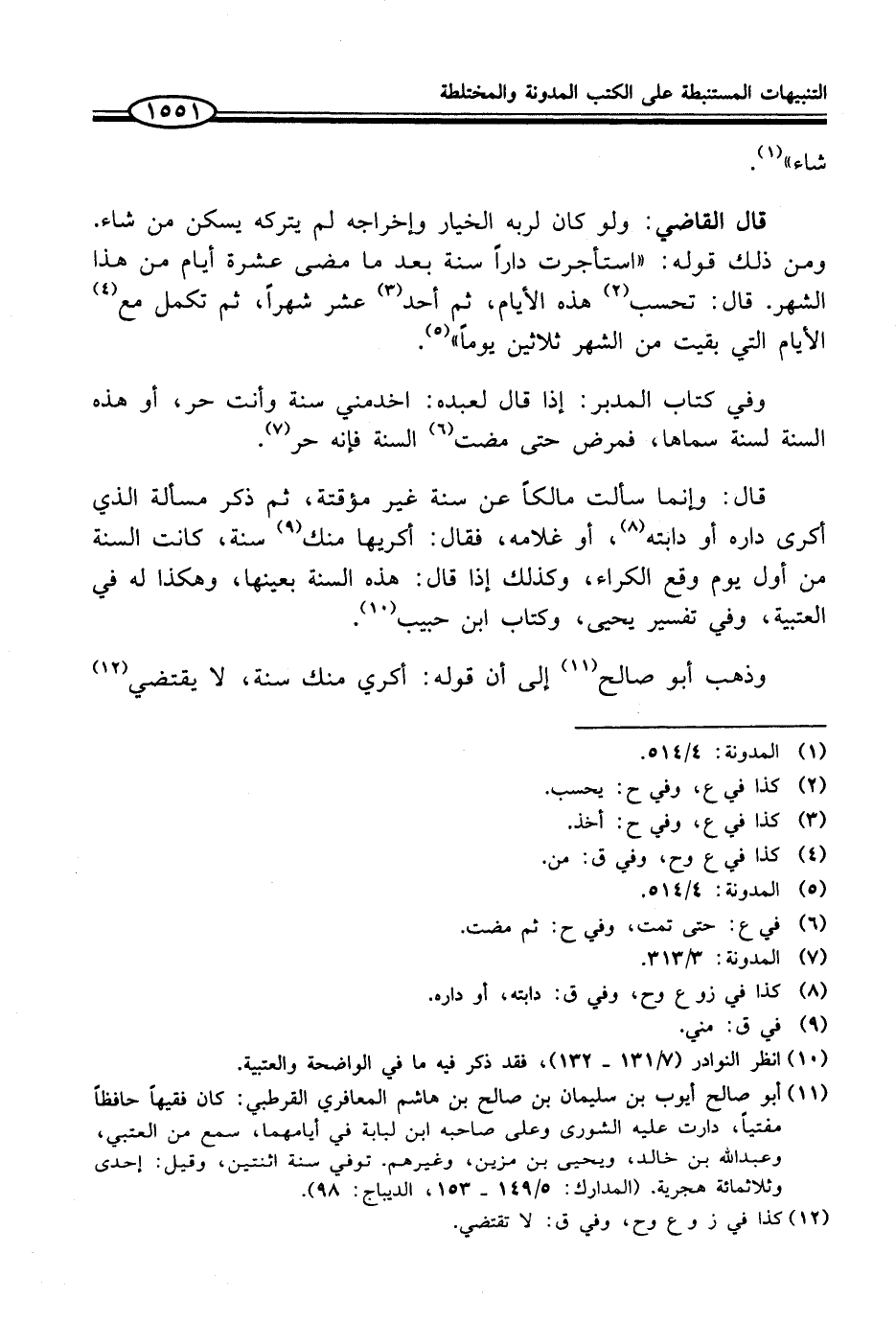 (¬11) أبو صالح أيوب بن سليمان بن صالح بن هاشم المعافري القرطبي: كان فقيهاً حافظاً مفتياً، دارت عليه الشورى وعلى صاحبه ابن لبابة في أيامهما، سمع من العتبي، وعبد الله بن خالد، ويحيى بن مزين، وغيرهم. توفي سنة اثنتين، وقيل: إحدى وثلاثمائة هجرية. (المدارك: 5/ 149 - 153، الديباج: 98).