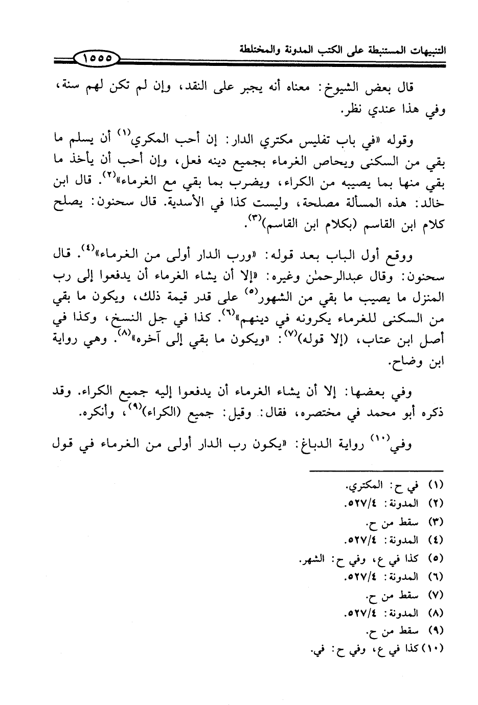 وقوله "في باب تفليس مكتري الدار: إن أحب المكري (¬1) أن يسلم ما بقي من السكنى ويحاص الغرماء بجميع دينه فعل، وإن أحب أن يأخذ ما بقي منها بما يصيبه من الكراء، ويضرب بما بقي مع الغرماء" (¬2). قال ابن خالد: هذه المسألة مصلحة، وليست كذا في الأسدية. قال سحنون: يصلح كلام ابن القاسم (بكلام ابن القاسم) (¬3).