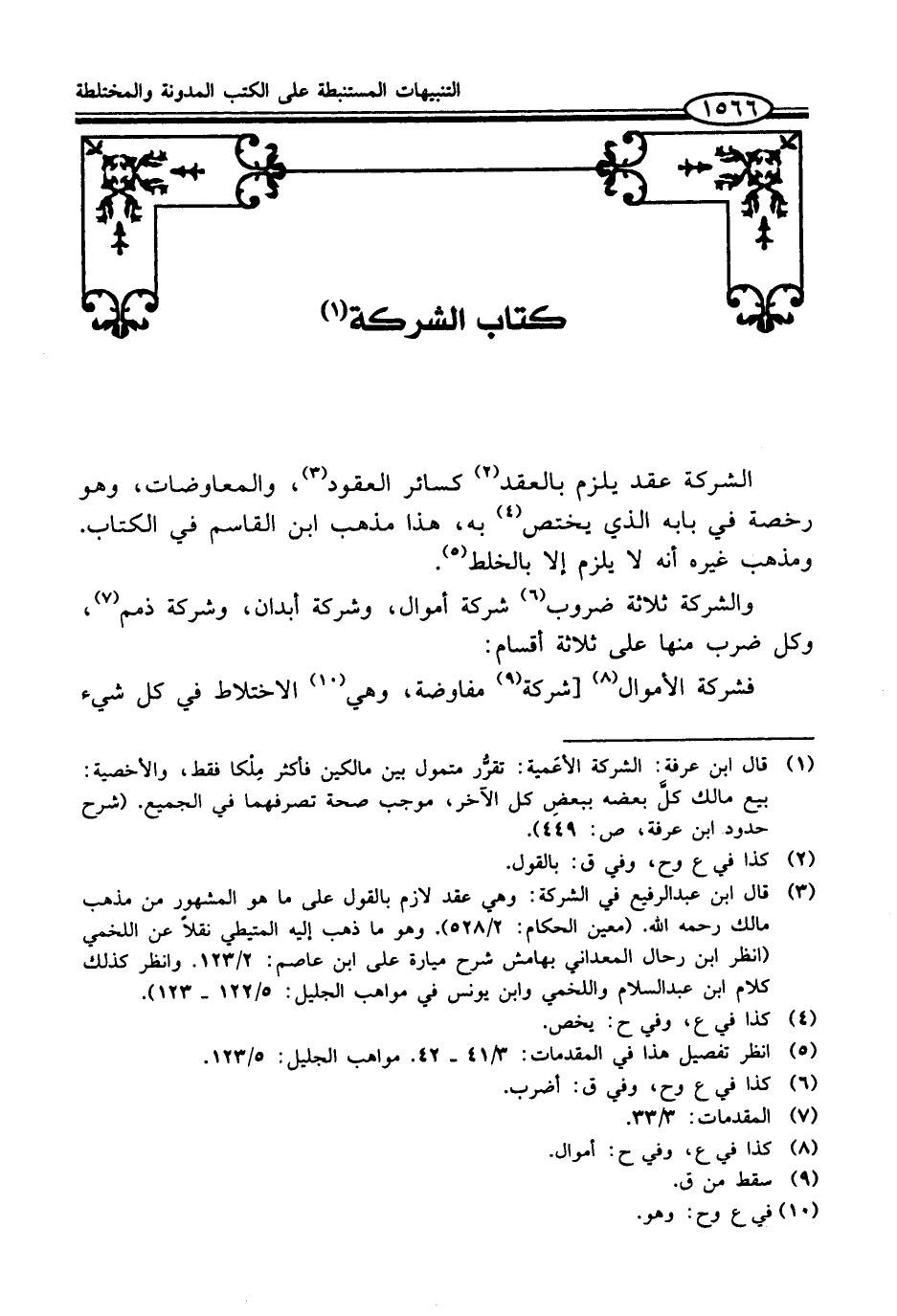 (¬3) قال ابن عبد الرفيع في الشركة: وهي عقد لازم بالقول على ما هو المشهور من مذهب مالك رحمه الله. (معين الحكام: 2/ 528). وهو ما ذهب إليه المتيطي نقلاً عن اللخمي (انظر ابن رحال المعداني بهامش شرح ميارة على ابن عاصم: 2/ 123. وانظر كذلك كلام ابن عبد السلام واللخمي وابن يونس في مواهب الجليل: 5/ 122 - 123).