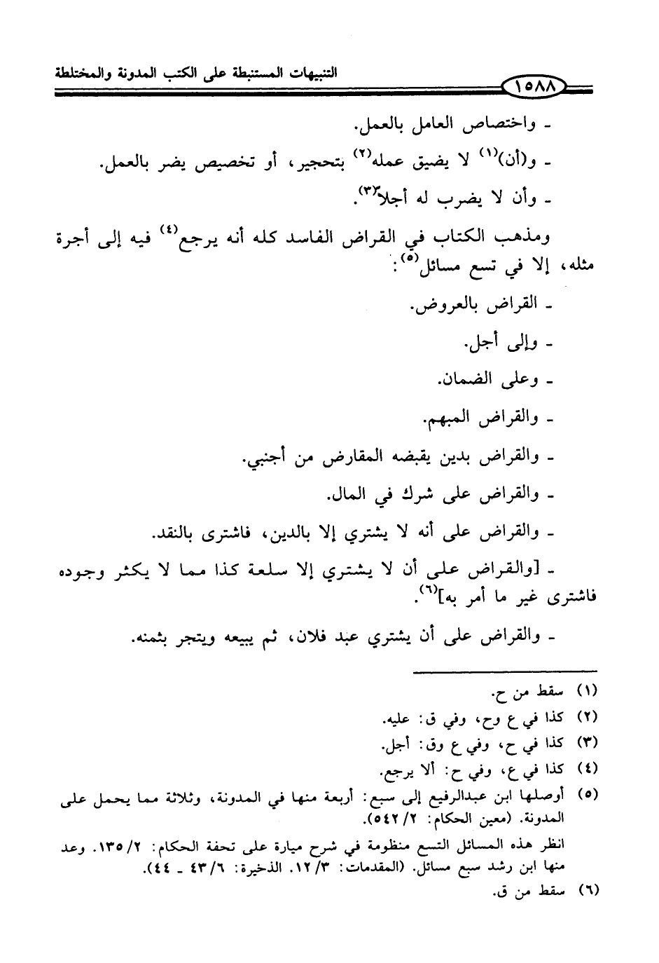 انظر هذه المسائل التسع منظومة في شرح ميارة على تحفة الحكام: 2/ 135. وعد منها ابن رشد سبع مسائل. (المقدمات: 3/ 12. الذخيرة: 6/ 43 - 44).