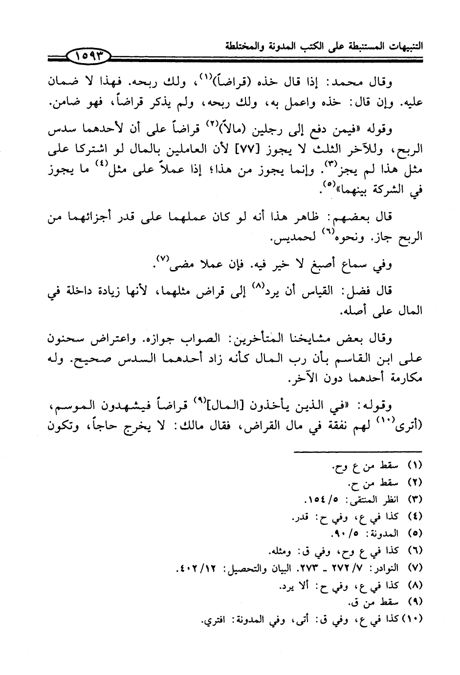 وقوله "فيمن دفع إلى رجلين (مالاً) (¬2) قراضاً على أن لأحدهما سدس الربح، وللآخر الثلث لا يجوز [77] لأن العاملين بالمال لو اشتركا على مثل هذا لم يجز (¬3). وإنما يجوز من هذا؛ إذا عملا على مثل (¬4) ما يجوز في الشركة بينهما" (¬5).
