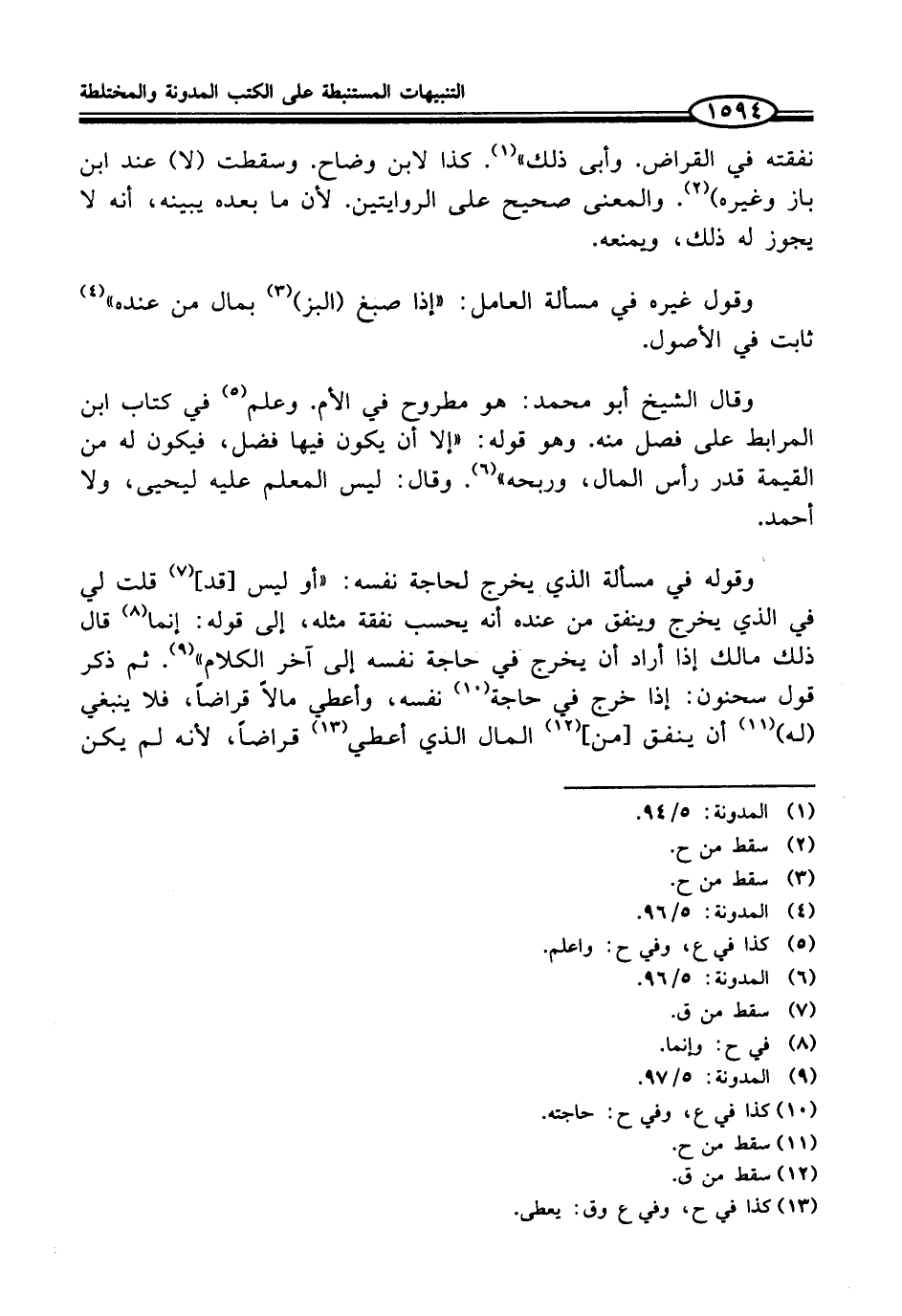 وقوله في مسألة الذي يخرج لحاجة نفسه: "أو ليس [قد] (¬7) قلت لي في الذي يخرج وينفق من عنده أنه يحسب نفقة مثله، إلى قوله: إنما (¬8) قال ذلك مالك إذا أراد أن يخرج في حاجة نفسه إلى آخر الكلام" (¬9). ثم ذكر قول سحنون: إذا خرج في حاجة (¬10) نفسه، وأعطي مالاً قراضاً، فلا ينبغي (له) (¬11) أن ينفق [من] (¬12) المال الذي أعطي (¬13) قراضاً، لأنه لم يكن