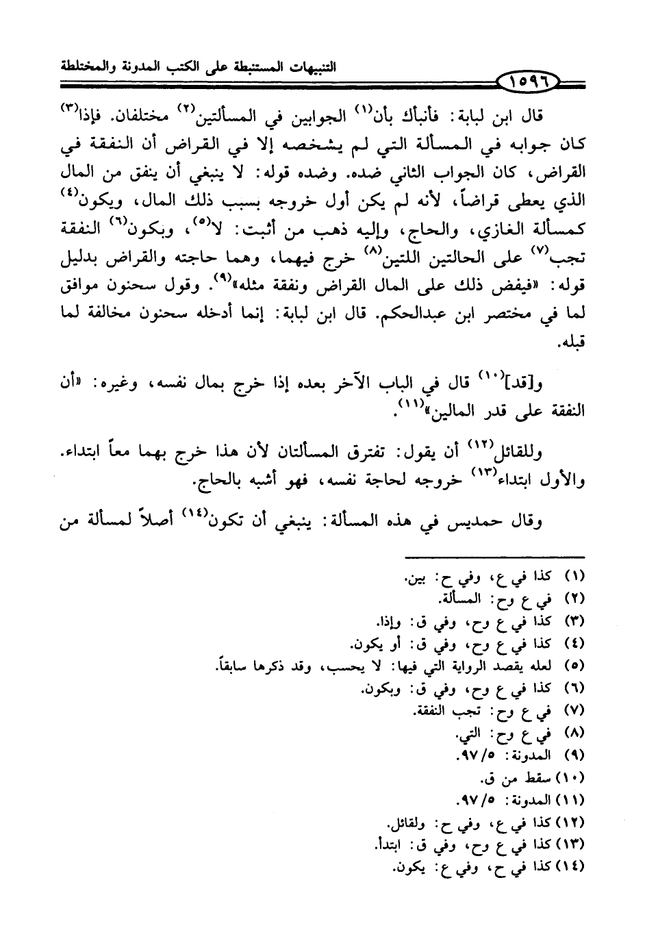 قال ابن لبابة: فأنبأك بأن (¬1) الجوابين في المسألتين (¬2) مختلفان. فإذا (¬3) كان جوابه في المسألة التي لم يشخصه إلا في القراض أن النفقة في القراض، كان الجواب الثاني ضده. وضده قوله: لا ينبغي أن ينفق من المال الذي يعطى قراضاً، لأنه لم يكن أول خروجه بسبب ذلك المال، ويكون (¬4) كمسألة الغازي، والحاج، وإليه ذهب من أثبت: لا (¬5)، وبكون (¬6) النفقة تجب (¬7) على الحالتين اللتين (¬8) خرج فيهما، وهما حاجته والقراض بدليل قوله: "فيفض ذلك على المال القراض ونفقة مثله" (¬9). وقول سحنون موافق لما في مختصر ابن عبد الحكم. قال ابن لبابة: إنما أدخله سحنون مخالفة لما قبله.