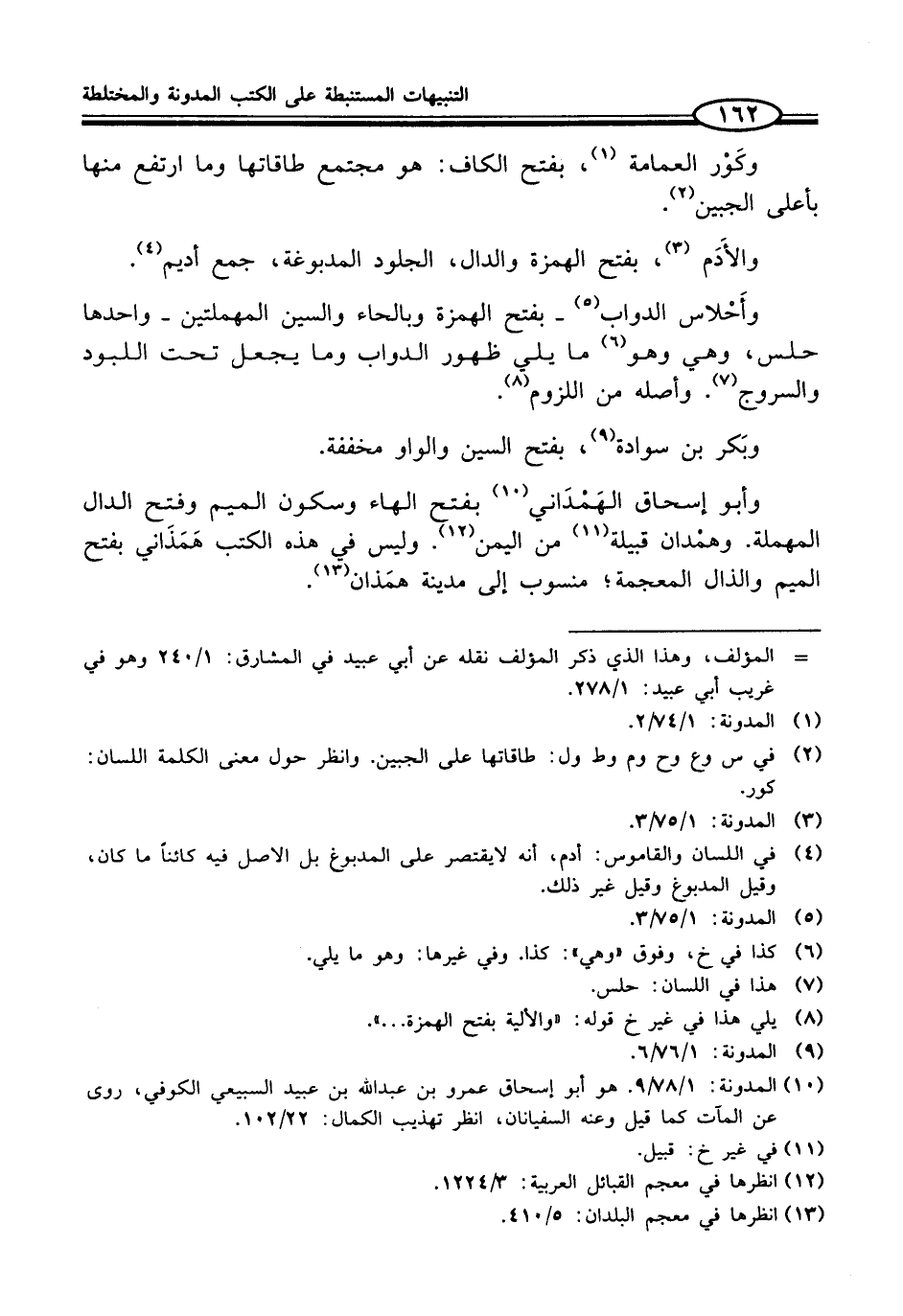 وأبو إسحاق الهَمْدَاني (¬10) بفتح الهاء وسكون الميم وفتح الدال المهملة. وهمْدان قبيلة (¬11) من اليمن (¬12). وليس في هذه الكتب هَمَذَاني بفتح الميم والذال المعجمة؛ منسوب إلى مدينة همَذان (¬13).