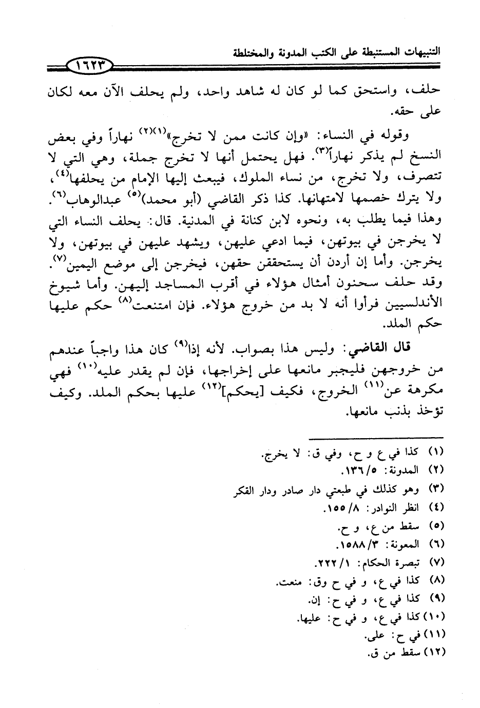وقوله في النساء: "وإن كانت ممن لا تخرج" (¬1) (¬2) نهاراً وفي بعض النسخ لم يذكر نهاراً (¬3). فهل يحتمل أنها لا تخرج جملة، وهي التي لا تتصرف، ولا تخرج، من نساء الملوك، فيبعث إليها الإمام من يحلفها (¬4)، ولا يترك خصمها لامتهانها. كذا ذكر القاضي (أبو محمد) (¬5) عبد الوهاب (¬6). وهذا فيما يطلب به، ونحوه لابن كنانة في المدنية. قال: يحلف النساء التي لا يخرجن في بيوتهن، فيما ادعي عليهن، ويشهد عليهن في بيوتهن، ولا يخرجن. وأما إن أردن أن يستحققن حقهن، فيخرجن إلى موضع اليمين (¬7). وقد حلف سحنون أمثال هؤلاء في أقرب المساجد إليهن. وأما شيوخ الأندلسيين فرأوا أنه لا بد من خروج هؤلاء. فإن امتنعت (¬8) حكم عليها حكم الملد.