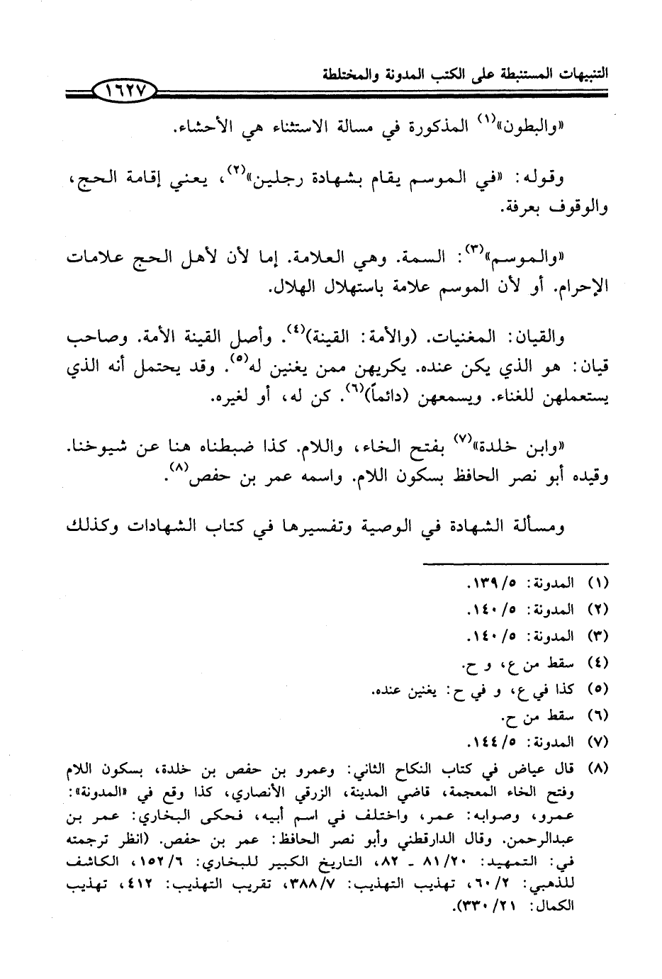 (¬8) قال عياض في كتاب النكاح الثاني: وعمرو بن حفص بن خلدة، بسكون اللام وفتح الخاء المعجمة، قاضي المدينة، الزرقي الأنصاري، كذا وقع في "المدونة": عمرو، وصوابه: عمر، واختلف في اسم أبيه، فحكى البخاري: عمر بن عبد الرحمن. وقال الدارقطني وأبو نصر الحافظ: عمر بن حفص. (انظر ترجمته في: التمهيد: 20/ 81 - 82، التاريخ الكبير للبخاري: 6/ 152، الكاشف للذهبي: 2/ 60، تهذيب التهذيب: 7/ 388، تقريب التهذيب: 412، تهذيب الكمال: 21/ 330).
