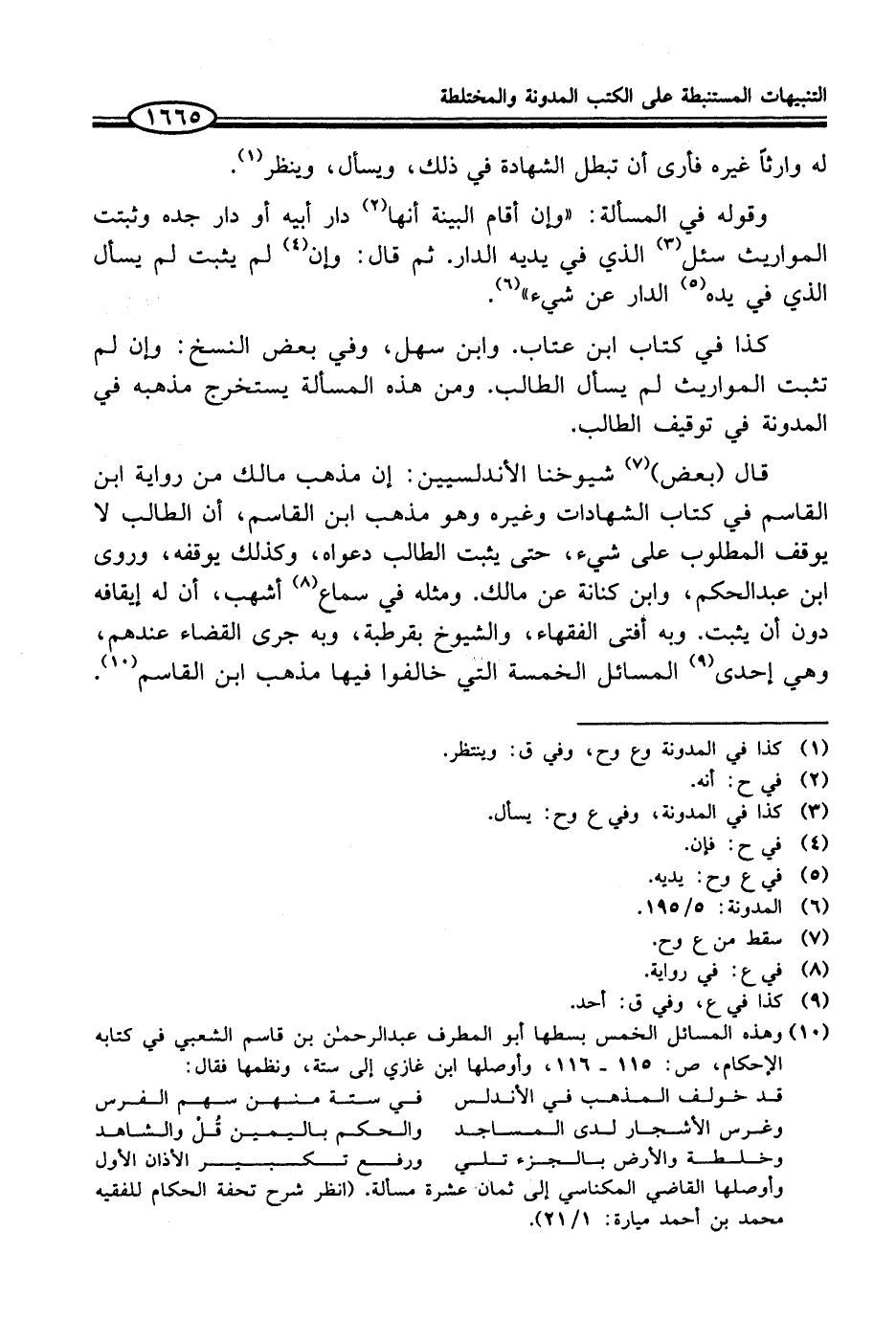 (¬10) وهذه المسائل الخمس بسطها أبو المطرف عبد الرحمن بن قاسم الشعبي في كتابه الإحكام، ص: 115 - 116، وأوصلها ابن غازي إلى ستة، ونظمها فقال: