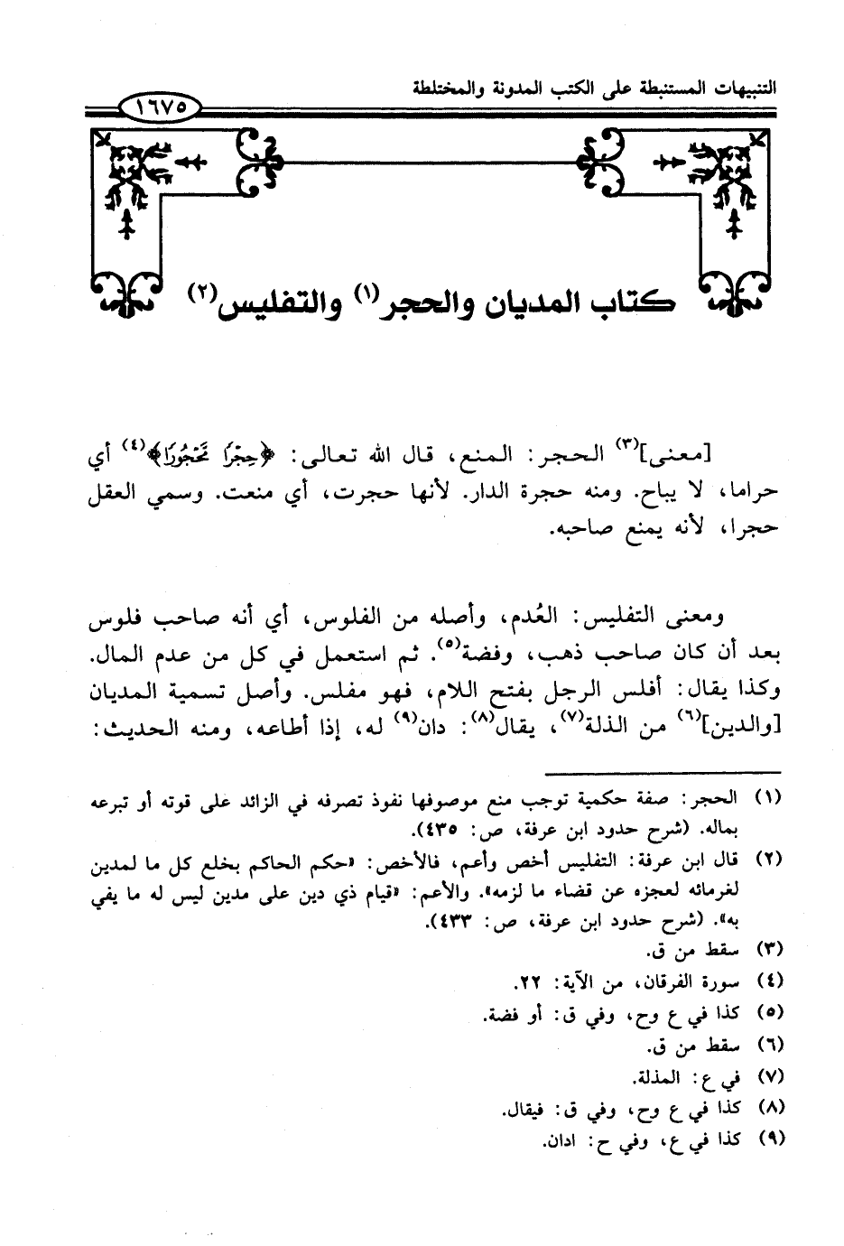 (¬1) الحجر: صفة حكمية توجب منع موصوفها نفوذ تصرفه في الزائد على قوته أو تبرعه بماله. (شرح حدود ابن عرفة، ص: 435).