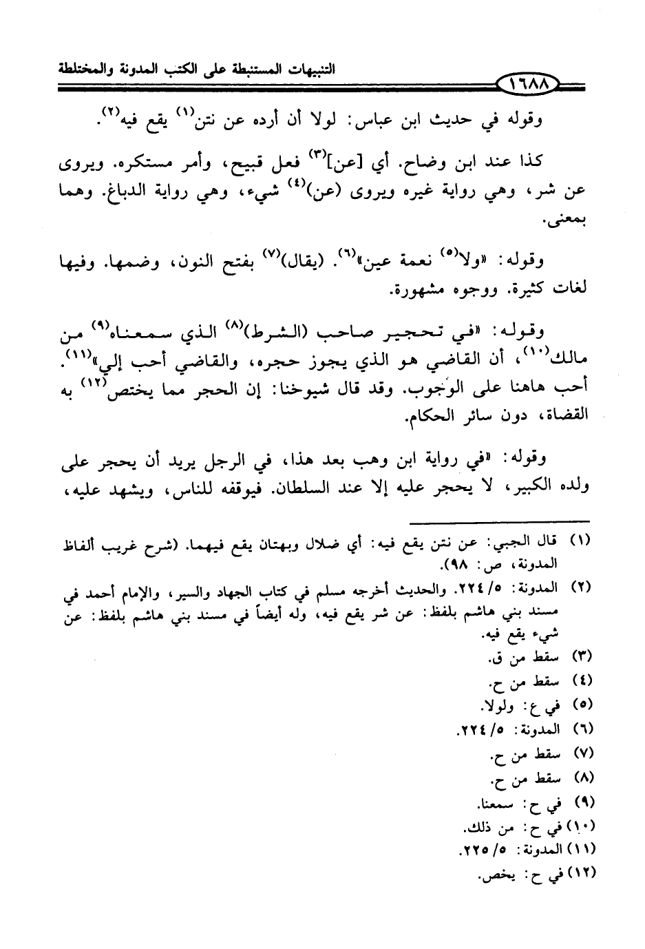 (¬2) المدونة: 5/ 224. والحديث أخرجه مسلم في كتاب الجهاد والسير، والإمام أحمد في مسند بني هاشم بلفظ: عن شر يقع فيه، وله أيضاً في مسند بني هاشم بلفظ: عن شيء يقع فيه.