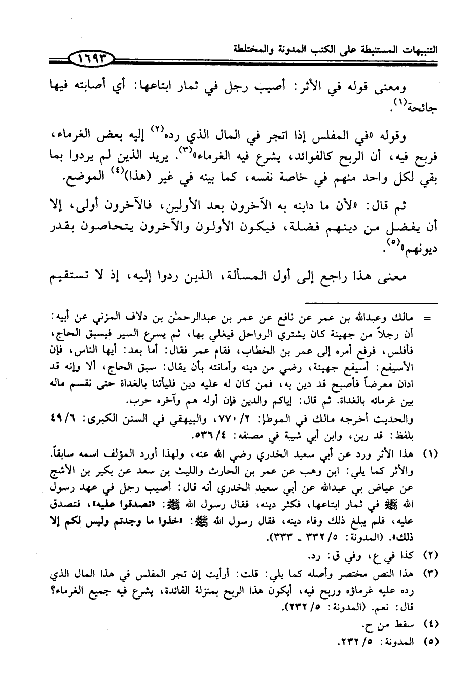 (¬3) هذا النص مختصر وأصله كما يلي: قلت: أرأيت إن تجر المفلس في هذا المال الذي رده عليه غرماؤه وربح فيه، أيكون هذا الربح بمنزلة الفائدة، يشرع فيه جميع الغرماء؟ قال: نعم. (المدونة: 5/ 232).