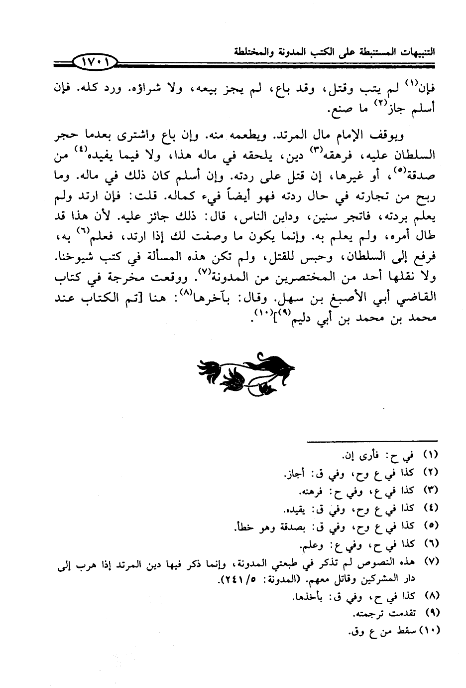 (¬7) هذه النصوص لم تذكر في طبعتي المدونة، وإنما ذكر فيها دين المرتد إذا هرب إلى دار المشركين وقاتل معهم. (المدونة: 5/ 241).