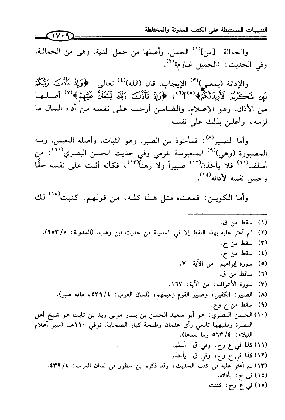 (¬10) الحسن البصري: هو أبو سعيد الحسن بن يسار مولى زيد بن ثابت هو شيخ أهل البصرة وفقيهها تابعي رأى عثمان وطلحة كبار الصحابة. توفي 110 هـ. (سير أعلام النبلاء: 4/ 563 وما بعدها).