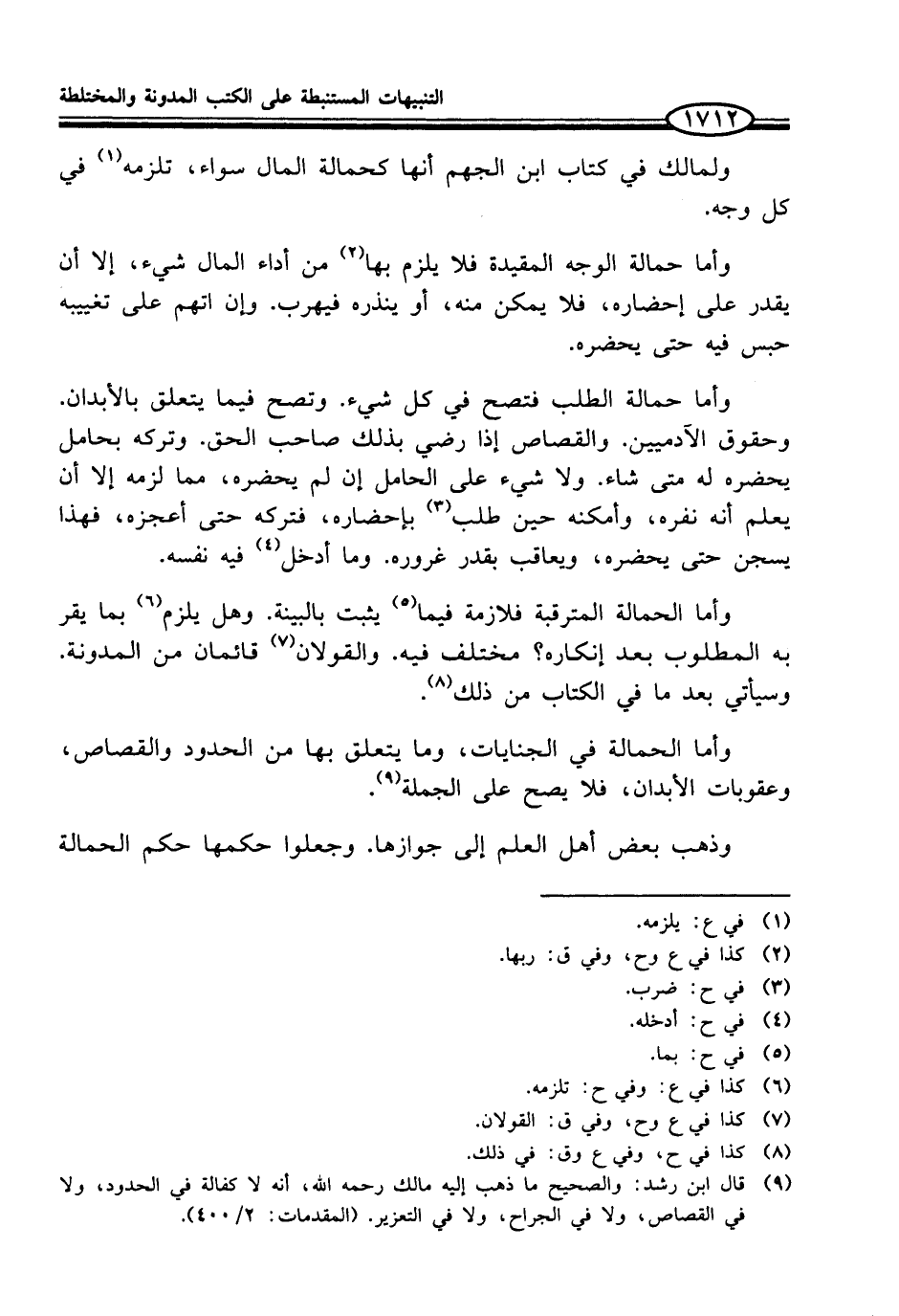 وأما الحمالة المترقبة فلازمة فيما (¬5) يثبت بالبينة. وهل يلزم (¬6) بما يقر به المطلوب بعد إنكاره؟ مختلف فيه. والقولان (¬7) قائمان من المدونة. وسيأتي بعد ما في الكتاب من ذلك (¬8).