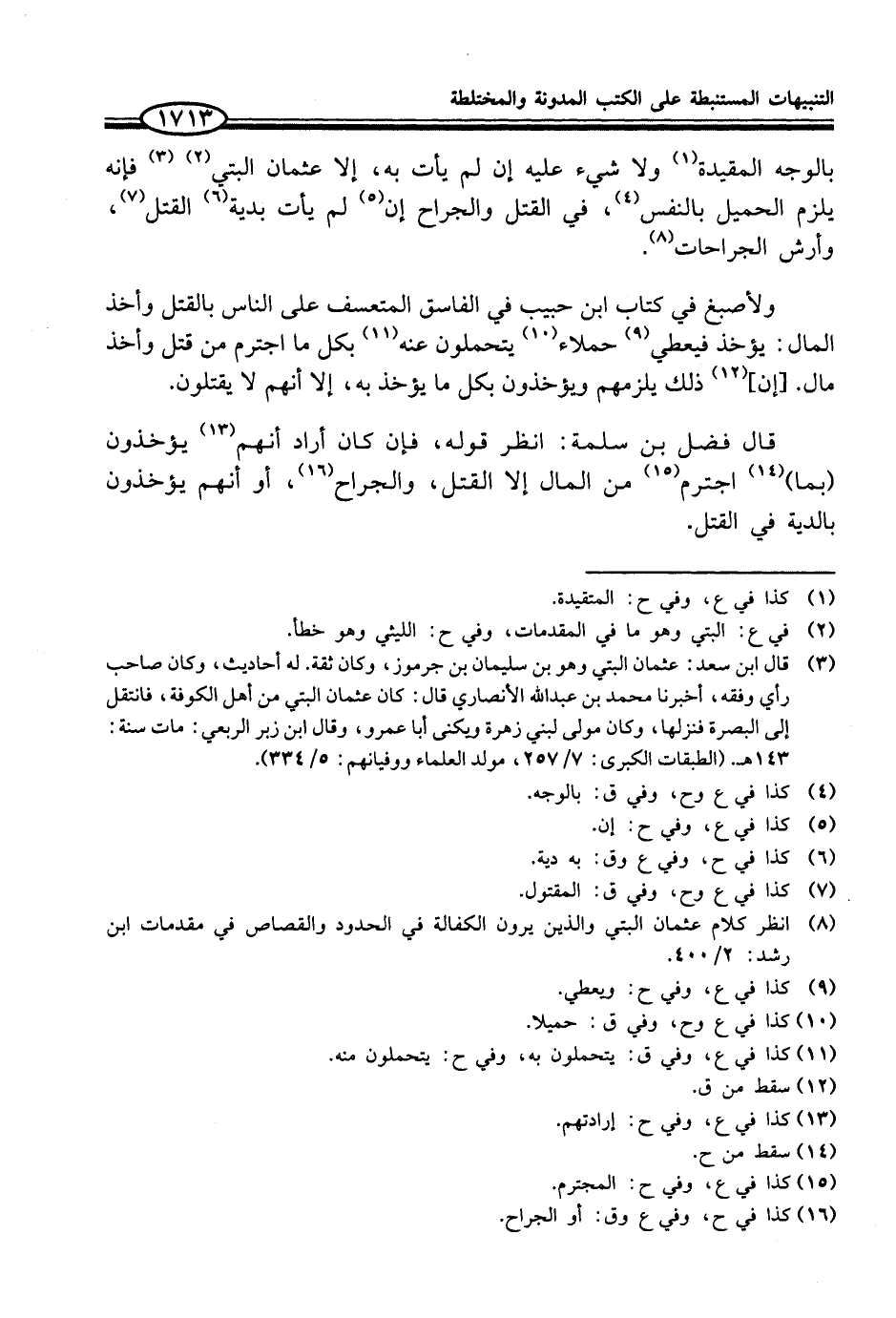 (¬3) قال ابن سعد: عثمان البتي وهو بن سليمان بن جرموز، وكان ثقة. له أحاديث، وكان صاحب رأي وفقه، أخبرنا محمد بن عبد الله الأنصاري قال: كان عثمان البتي من أهل الكوفة، فانتقل إلى البصرة فنزلها، وكان مولى لبني زهرة ويكنى أبا عمرو، وقال ابن زبر الربعي: مات سنة: 143 هـ. (الطبقات الكبرى: 7/ 257، مولد العلماء ووفيانهم: 5/ 334).