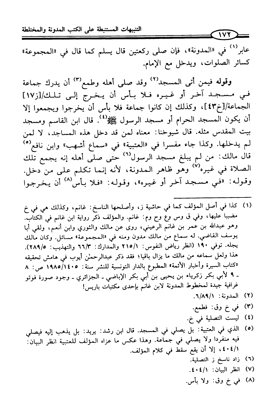 (¬1) كذا في أصل المؤلف كما في حاشية ز، وأصلحها الناسخ: غانم، وكذلك هي في خ مضببا عليها، وفي ق وس وع وح وم: غانم. والمؤلف ذكر رواية ابن غانم في الكتاب. وهو عبد الله بن عمر بن غانم الرعيني، روى عن مالك والثوري وابن أنعم، ولقي أبا يوسف القاضي. له سماع من مالك مدون ومنه في "المجموعة" مسائل. وكان مالك يجله. توفي 190 (انظر رياض النفوس: 1/ 215 والمدارك: 3/ 66 والتهذيب: 5/ 289). هذا ولعل سماعه من مالك ما يزال باقيا؛ فقد ذكر عبد الرحمن أيوب في هامش تحقيقه "كتاب السيرة وأخبار الأئمة" المطبوع بالدار التونسية للنشر سنة: 1405/ 1985 ص: 8 - 9 لأبي بكر زكرياء بن يحيى بن أبي بكر الإباضي - الجزائري - وجود صورة فوتو غرافية جيدة لمخطوط المدونة لابن غانم بإحدى مكتبات باريس!