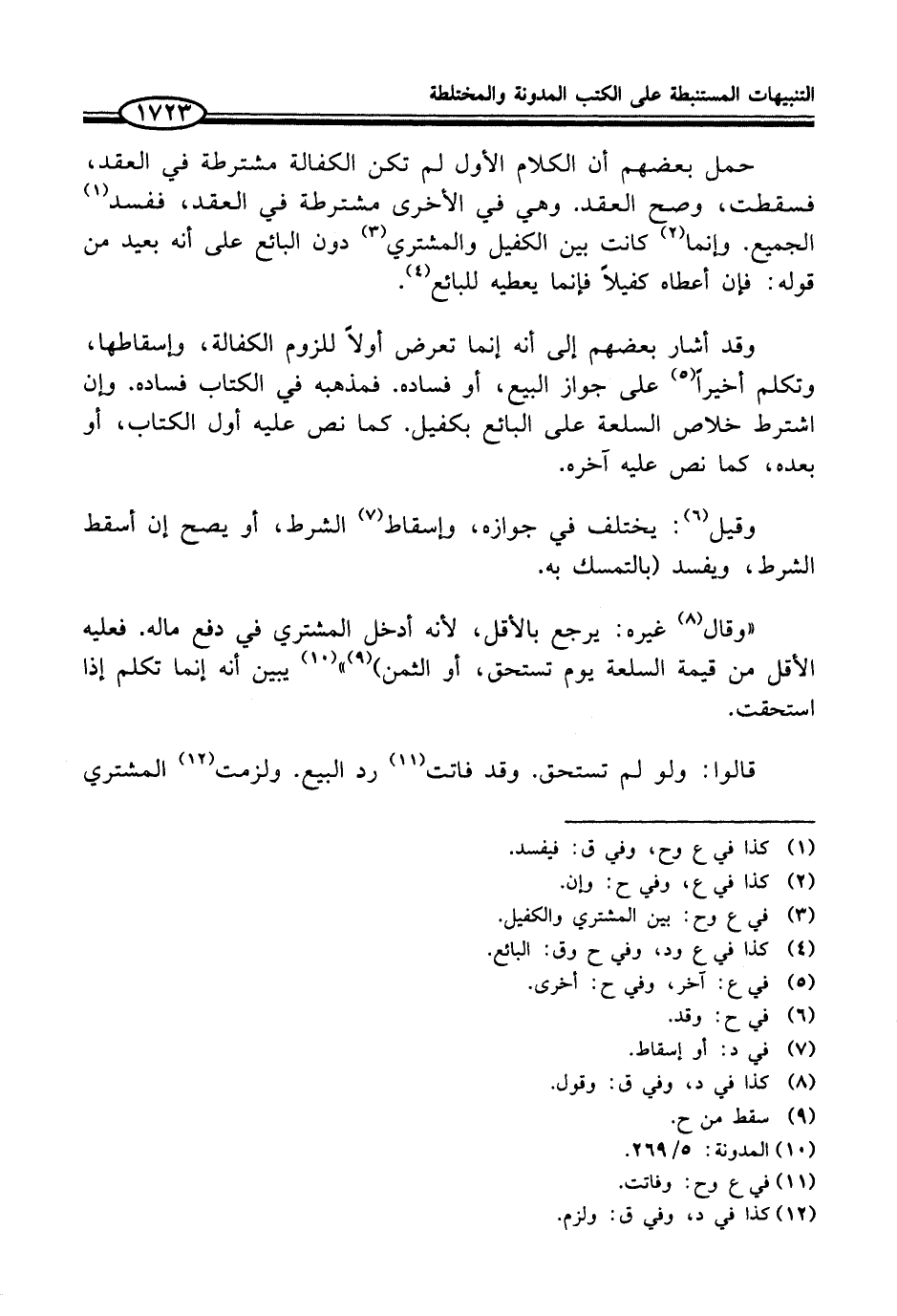 وقد أشار بعضهم إلى أنه إنما تعرض أولاً للزوم الكفالة، وإسقاطها، وتكلم أخيراً (¬5) على جواز البيع، أو فساده. فمذهبه في الكتاب فساده. وإن اشترط خلاص السلعة على البائع بكفيل. كما نص عليه أول الكتاب، أو بعده، كما نص عليه آخره.