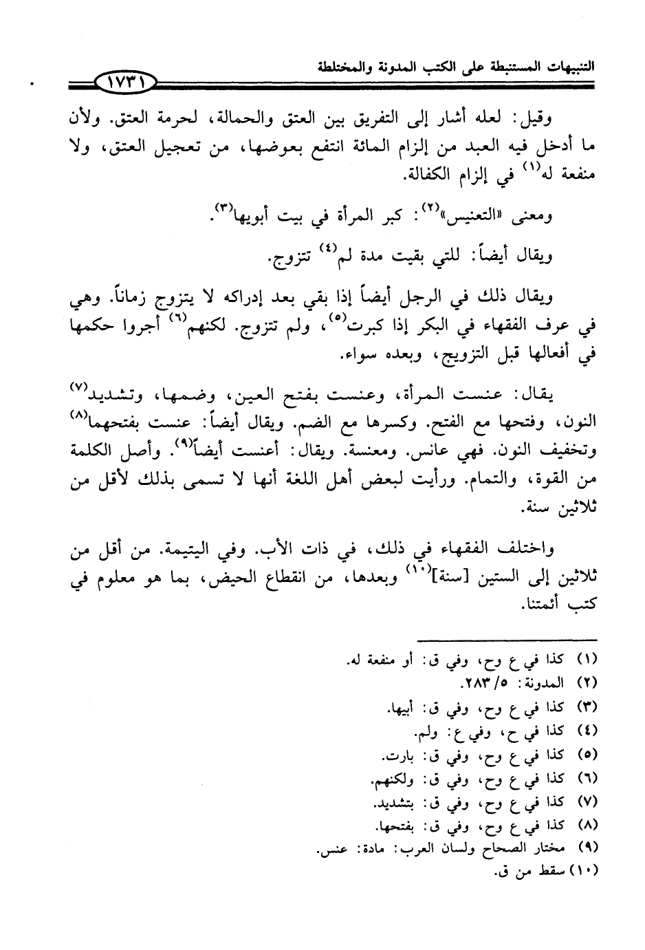 يقال: عنست المرأة، وعنست بفتح العين، وضمها، وتشديد (¬7) النون، وفتحها مع الفتح. وكسرها مع الضم. ويقال أيضاً: عنست بفتحهما (¬8) وتخفيف النون. فهي عانس. ومعنسة. ويقال: أعنست أيضاً (¬9). وأصل الكلمة من القوة، والتمام. ورأيت لبعض أهل اللغة أنها لا تسمى بذلك لأقل من ثلاثين سنة.
