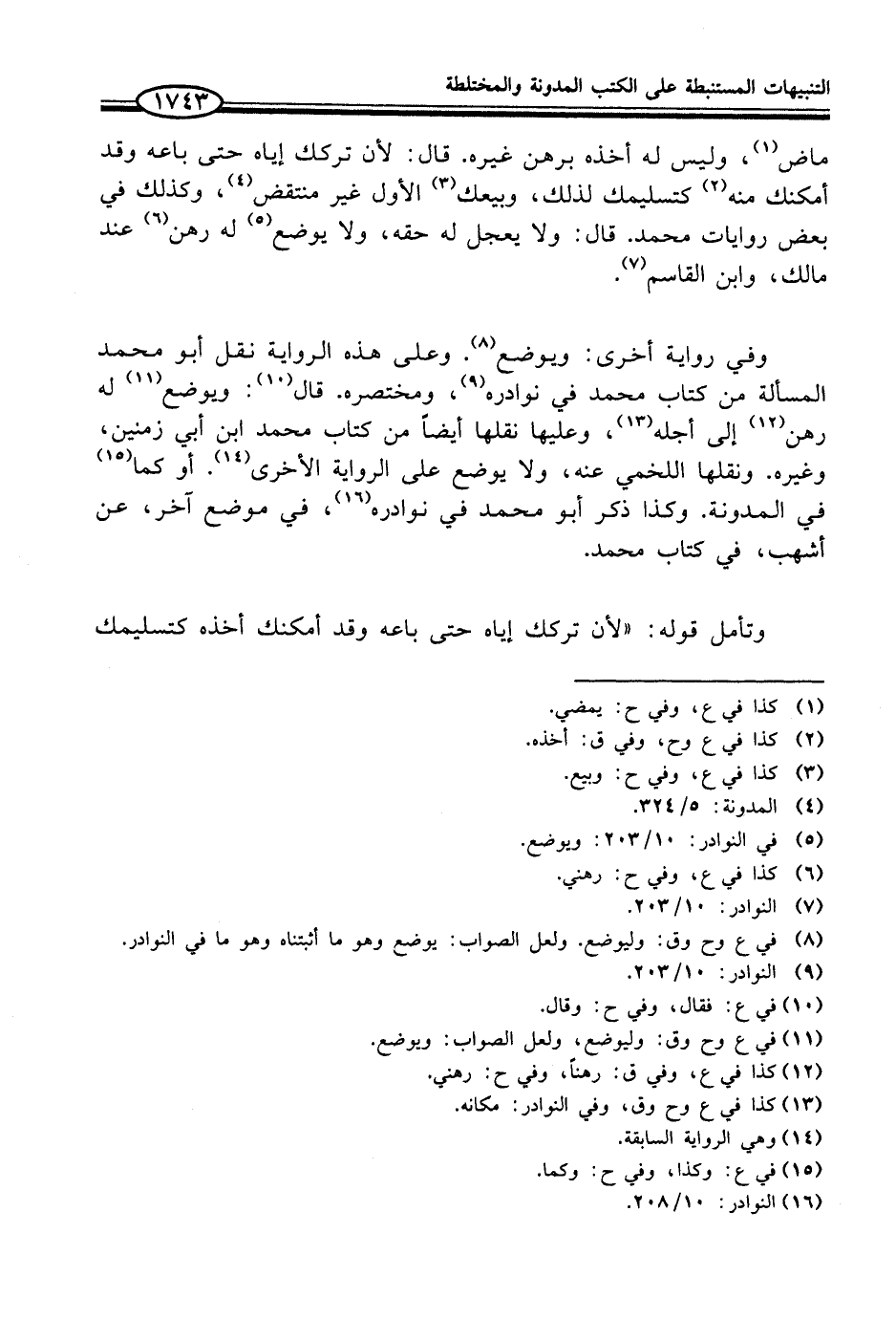 وفي رواية أخرى: ويوضع (¬8). وعلى هذه الرواية نقل أبو محمد المسألة من كتاب محمد في نوادره (¬9)، ومختصره. قال (¬10): ويوضع (¬11) له رهن (¬12) إلى أجله (¬13)، وعليها نقلها أيضاً من كتاب محمد ابن أبي زمنين، وغيره. ونقلها اللخمي عنه، ولا يوضع على الرواية الأخرى (¬14). أو كما (¬15) في المدونة. وكذا ذكر أبو محمد في نوادره (¬16)، في موضع آخر، عن أشهب، في كتاب محمد.