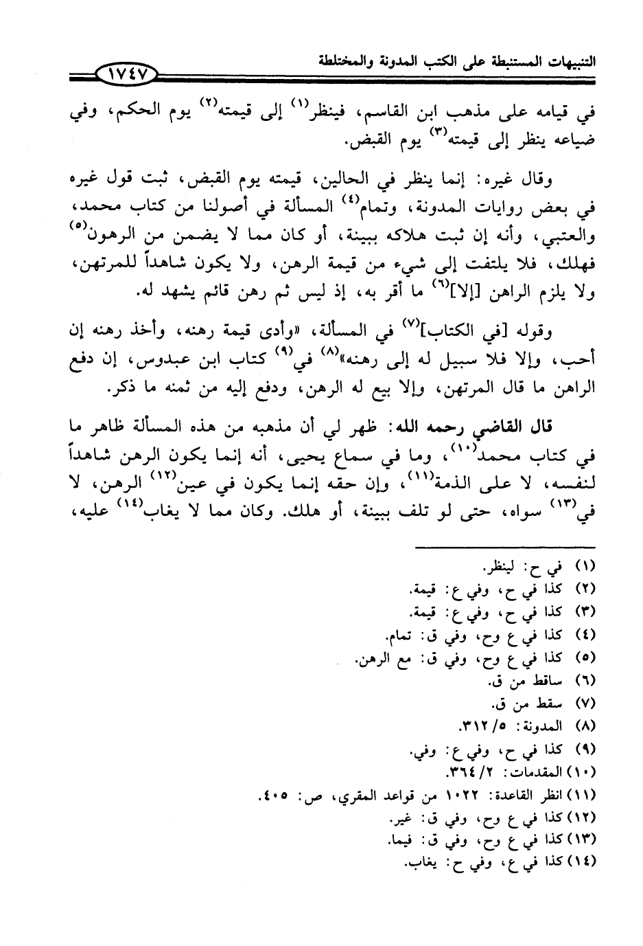 وقال غيره: إنما ينظر في الحالين، قيمته يوم القبض، ثبت قول غيره في بعض روايات المدونة، وتمام (¬4) المسألة في أصولنا من كتاب محمد، والعتبي، وأنه إن ثبت هلاكه ببينة، أو كان مما لا يضمن من الرهون (¬5) فهلك، فلا يلتفت إلى شيء من قيمة الرهن، ولا يكون شاهداً للمرتهن، ولا يلزم الراهن [إلا] (¬6) ما أقر به، إذ ليس ثم رهن قائم يشهد له.