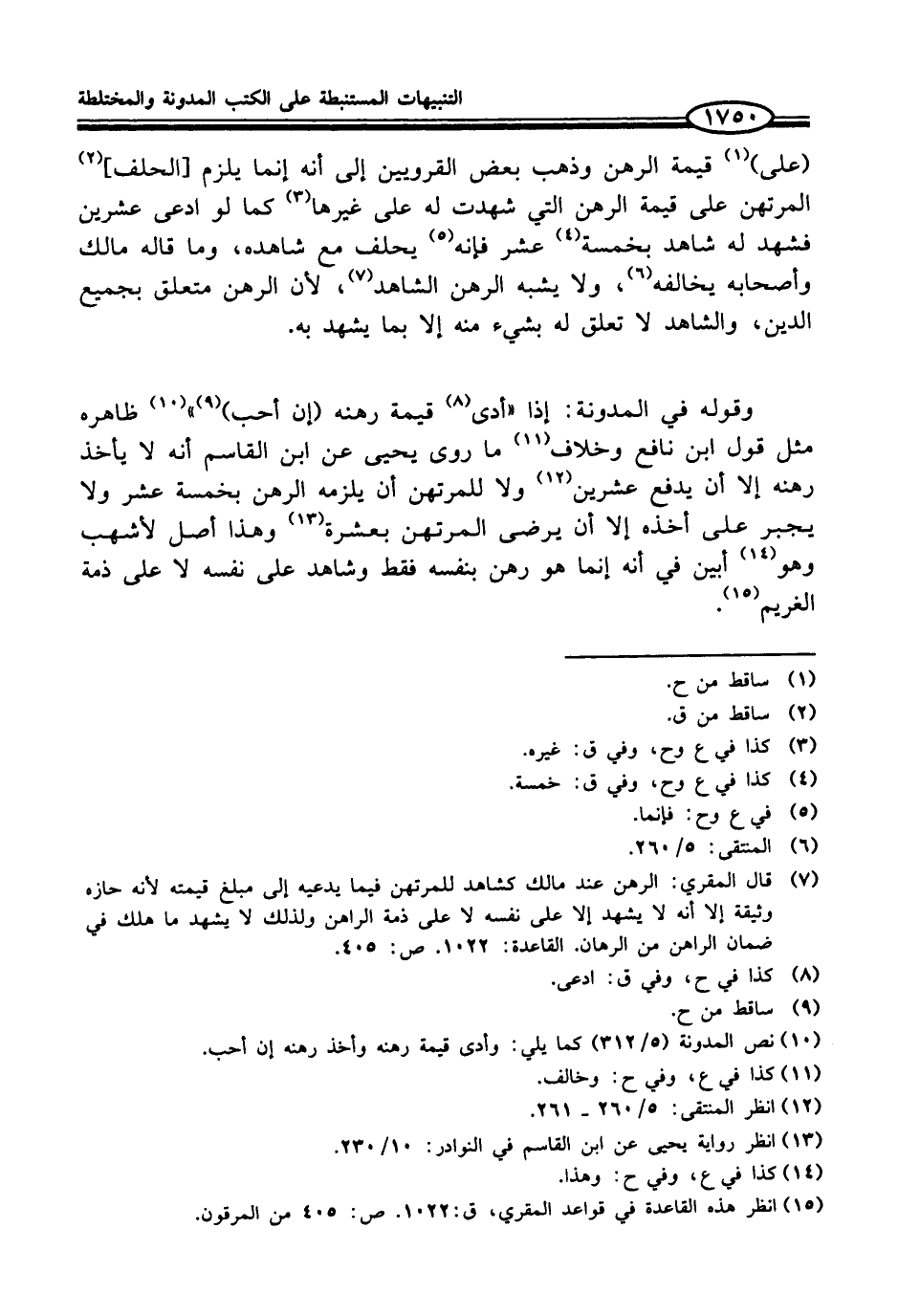 (¬7) قال المقري: الرهن عند مالك كشاهد للمرتهن فيما يدعيه إلى مبلغ قيمته لأنه حازه وثيقة إلا أنه لا يشهد إلا على نفسه لا على ذمة الراهن ولذلك لا يشهد ما هلك في ضمان الراهن من الرهان. القاعدة: 1022. ص: 405.