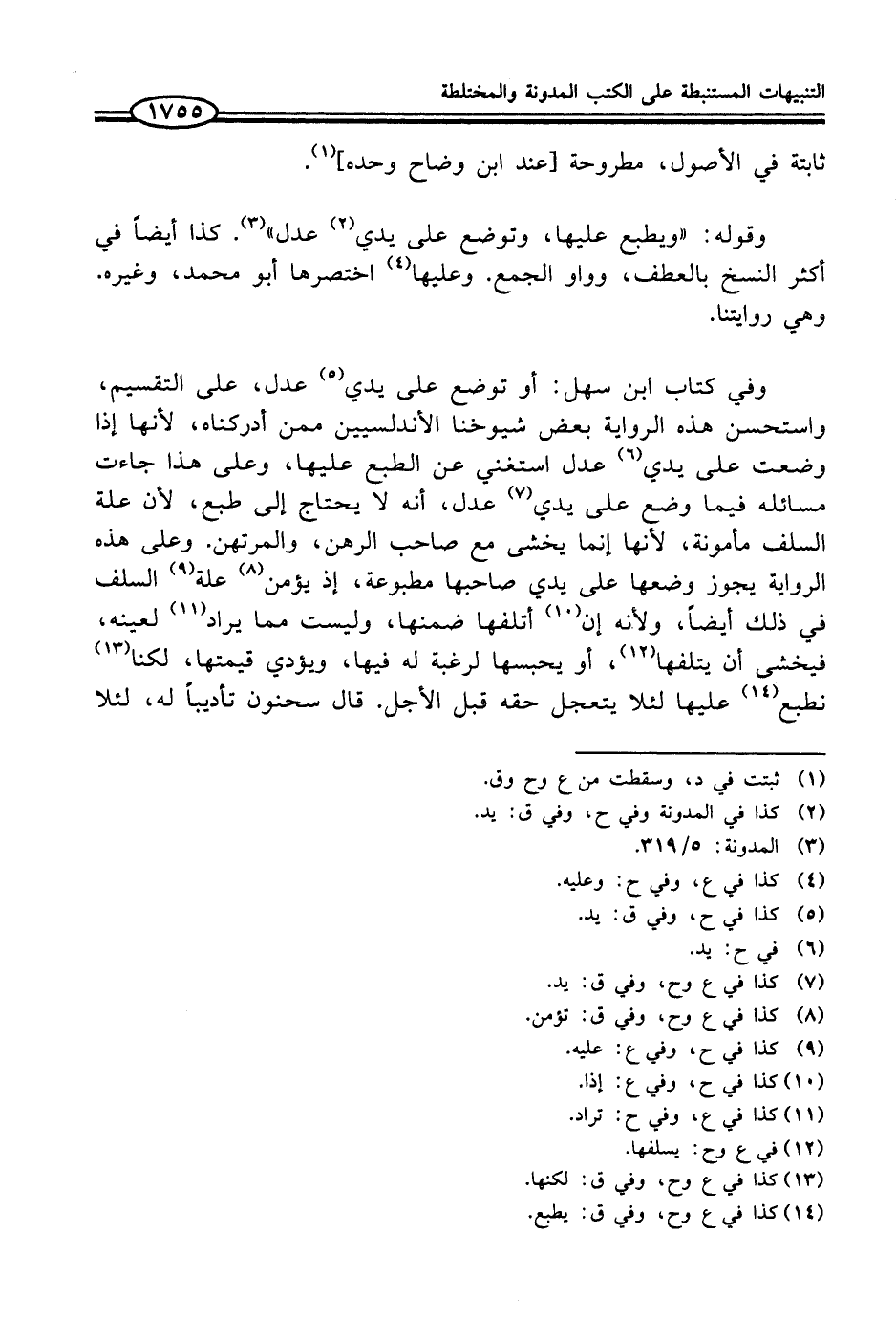 وفي كتاب ابن سهل: أو توضع على يدي (¬5) عدل، على التقسيم، واستحسن هذه الرواية بعض شيوخنا الأندلسيين ممن أدركناه، لأنها إذا وضعت على يدي (¬6) عدل استغني عن الطبع عليها، وعلى هذا جاءت مسائله فيما وضع على يدي (¬7) عدل، أنه لا يحتاج إلى طبع، لأن علة السلف مأمونة، لأنها إنما يخشى مع صاحب الرهن، والمرتهن. وعلى هذه الرواية يجوز وضعها على يدي صاحبها مطبوعة، إذ يؤمن (¬8) علة (¬9) السلف في ذلك أيضاً، ولأنه إن (¬10) أتلفها ضمنها، وليست مما يراد (¬11) لعينه، فيخشى أن يتلفها (¬12)، أو يحبسها لرغبة له فيها، ويؤدي قيمتها، لكنا (¬13) نطبع (¬14) عليها لئلا يتعجل حقه قبل الأجل. قال سحنون تأديباً له، لئلا