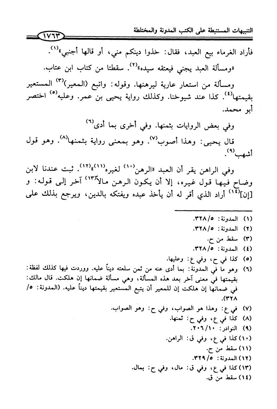 (¬6) وهو ما في المدونة: بما أدى عنه من ثمن سلعته ديناً عليه. ووردت فيها كذلك لفظة: بقيمتها في معنى آخر بعد هذه المسألة، وهي مسألة ضمانها إن هلكت. قال مالك: في ضمانها إن هلكت إن للمعير أن يتبع المستعير بقيمتها ديناً عليه. (المدونة: 5/ 328).