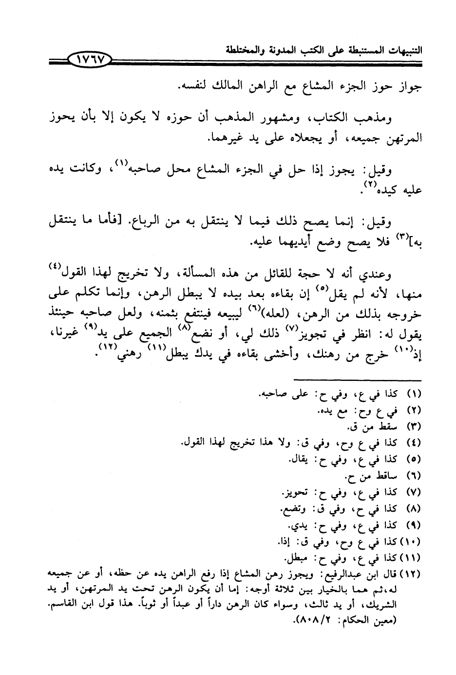 (¬12) قال ابن عبد الرفيع: ويجوز رهن المشاع إذا رفع الراهن يده عن حظه، أو عن جميعه له، ثم هما بالخيار بين ثلاثة أوجه: إما أن يكون الرهن تحت يد المرتهن، أو يد الشريك، أو يد ثالث، وسواء كان الرهن داراً أو عبداً أو ثوباً. هذا قول ابن القاسم. (معين الحكام: 2/ 808).