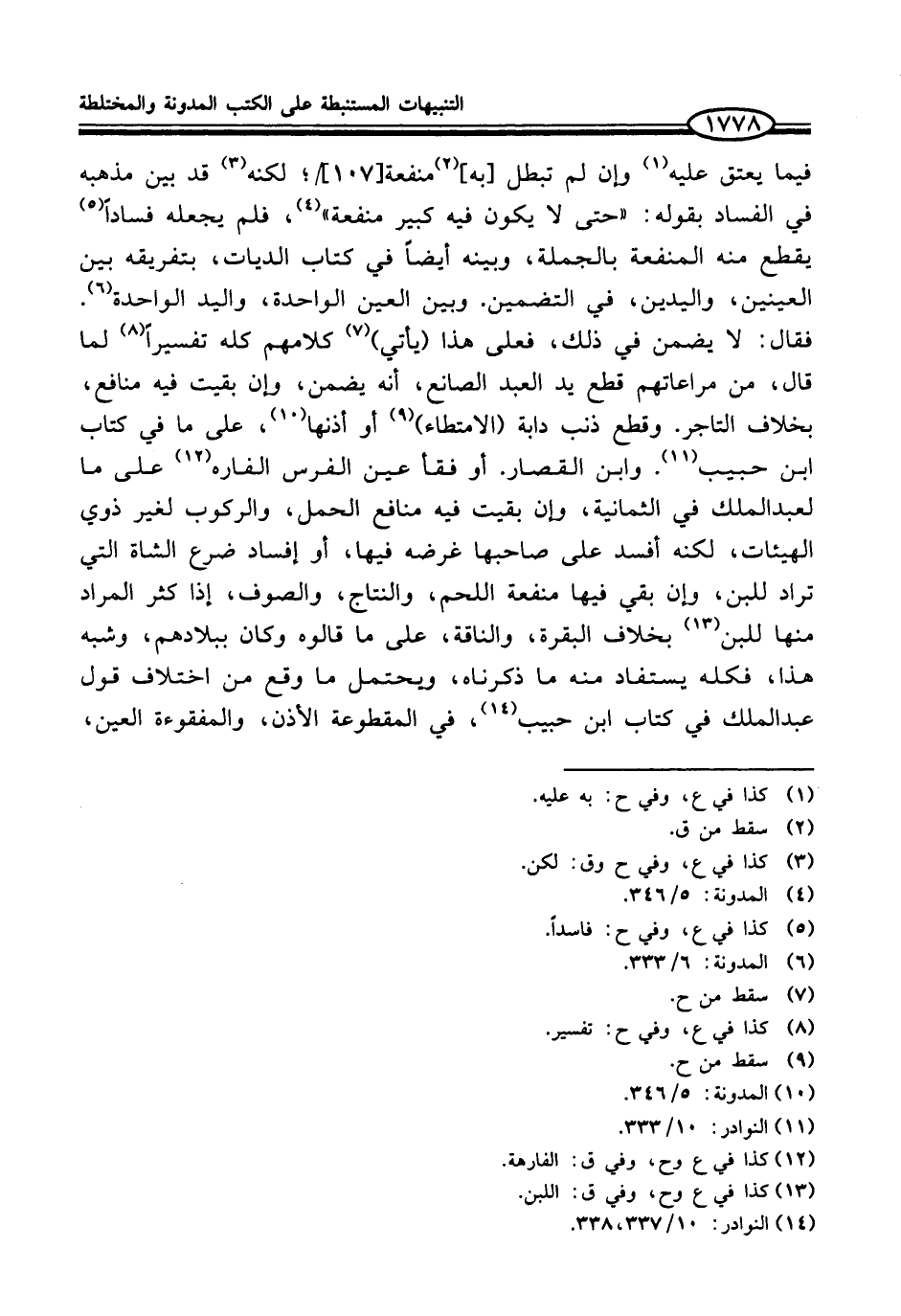 فيما يعتق عليه (¬1) وإن لم تبطل [به] (¬2) منفعة [107] /؛ لكنه (¬3) قد بين مذهبه في الفساد بقوله: "حتى لا يكون فيه كبير منفعة" (¬4)، فلم يجعله فساداً (¬5) يقطع منه المنفعة بالجملة، وبينه أيضاً في كتاب الديات، بتفريقه بين العينين، واليدين، في التضمين. وبين العين الواحدة، واليد الواحدة (¬6). فقال: لا يضمن في ذلك، فعلى هذا (يأتي) (¬7) كلامهم كله تفسيراً (¬8) لما قال، من مراعاتهم قطع يد العبد الصانع، أنه يضمن، وإن بقيت فيه منافع، بخلاف التاجر. وقطع ذنب دابة (الامتطاء) (¬9) أو أذنها (¬10)، على ما في كتاب ابن حبيب (¬11). وابن القصار. أو فقأ عين الفرس الفاره (¬12) على ما لعبد الملك في الثمانية، وإن بقيت فيه منافع الحمل، والركوب لغير ذوي الهيئات، لكنه أفسد على صاحبها غرضه فيها، أو إفساد ضرع الشاة التي تراد للبن, وإن بقي فيها منفعة اللحم، والنتاج، والصوف، إذا كثر المراد منها للبن (¬13) بخلاف البقرة، والناقة، على ما قالوه وكان ببلادهم، وشبه هذا، فكله يستفاد منه ما ذكرناه، ويحتمل ما وقع من اختلاف قول عبد الملك في كتاب ابن حبيب (¬14)، في المقطوعة الأذن، والمفقوءة العين،