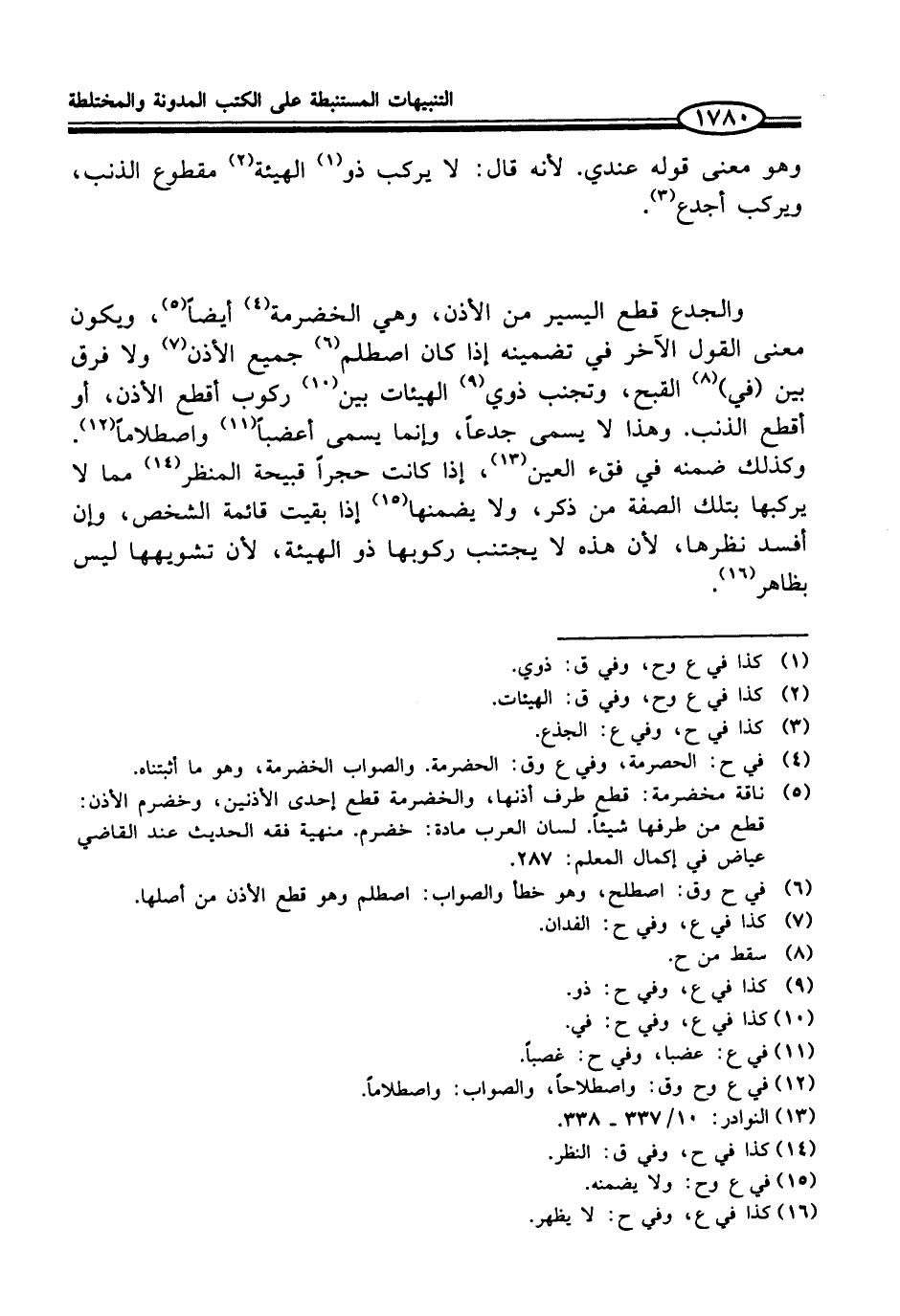 والجدع قطع اليسير من الأذن، وهي الخضرمة (¬4) أيضاً (¬5)، ويكون معنى القول الآخر في تضمينه إذا كان اصطلم (¬6) جميع الأذن (¬7) ولا فرق بين (في) (¬8) القبح، وتجنب ذوي (¬9) الهيئات بين (¬10) ركوب أقطع الأذن، أو أقطع الذنب. وهذا لا يسمى جدعاً، وإنما يسمى أعضباً (¬11) واصطلاماً (¬12). وكذلك ضمنه في ققء العين (¬13)، إذا كانت حجراً قبيحة المنظر (¬14) مما لا يركبها بتلك الصفة من ذكر، ولا يضمنها (¬15) إذا بقيت قائمة الشخص، وإن أفسد نظرها، لأن هذه لا يجتنب ركوبها ذو الهيئة، لأن تشويهها ليس بظاهر (¬16).