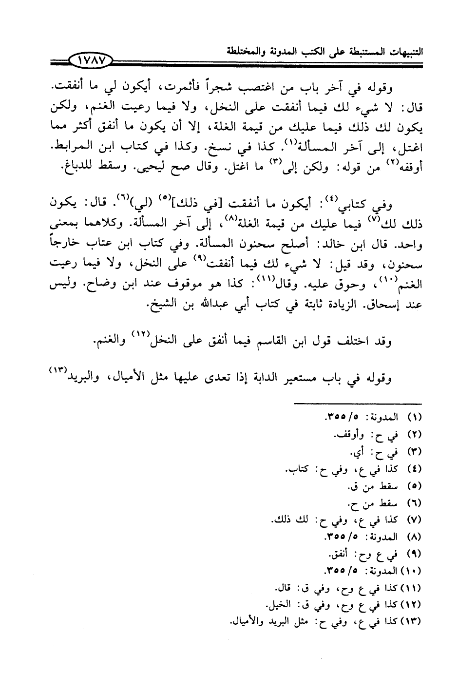 وفي كتابي (¬4): أيكون ما أنفقت [في ذلك] (¬5) (لي) (¬6). قال: يكون ذلك لك (¬7) فيما عليك من قيمة الغلة (¬8)، إلى آخر المسألة. وكلاهما بمعنى واحد. قال ابن خالد: أصلح سحنون المسألة. وفي كتاب ابن عتاب خارجاً سحنون، وقد قيل: لا شيء لك فيما أنفقت (¬9) على النخل، ولا فيما رعيت الغنم (¬10)، وحوق عليه. وقال (¬11): كذا هو موقوف عند ابن وضاح. وليس عند إسحاق. الزيادة ثابتة في كتاب أبي عبد الله بن الشيخ.